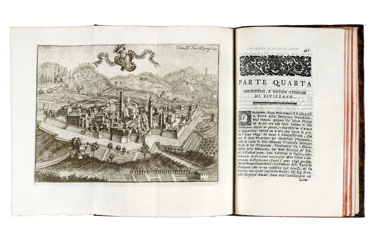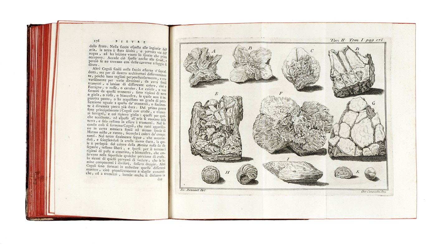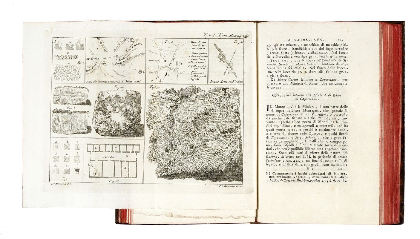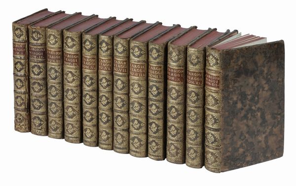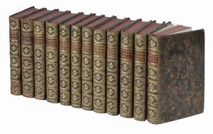 12 volumi in-8° (mm 204x135). Volumi ricchi di tavole calcografiche più volte ripiegate. Esemplare fresco. Testo non collazionato, presumibilmente completo, ma integro delle sue tavole. Legature in piena pelle marmorizzata, tagli rossi, e fregi con titoli in tassello dorati al dorso. Collazione completa su richiesta.
