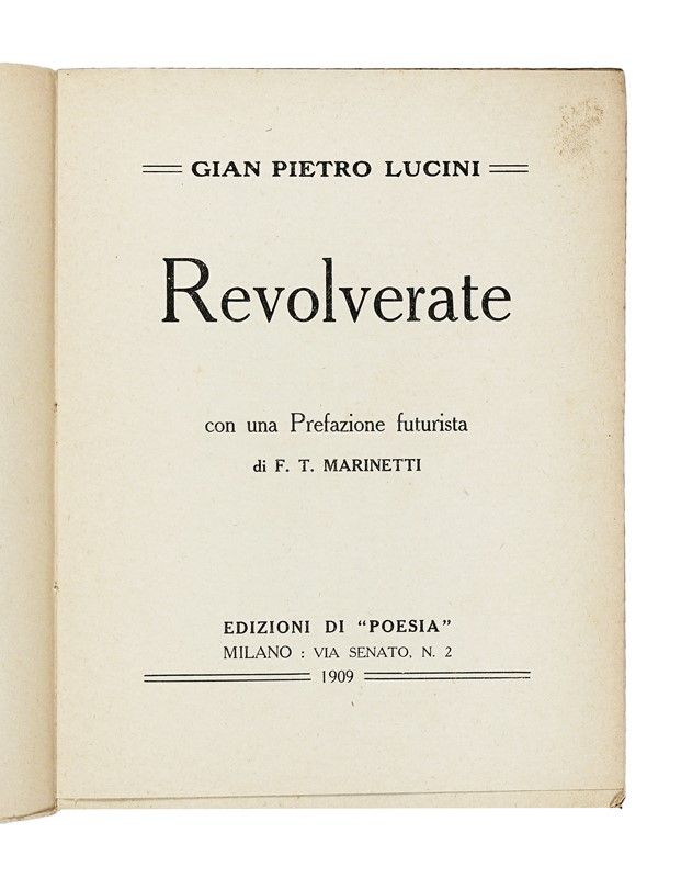 In-8° (mm 190x148). Buona copia in barbe. Brossura editoriale, con titoli in nero ai piatti e al dorso. Bruniture da esposizione al dorso, con una piccola mancanza alla cuffia inferiore e fioriture lievi ai piatti. SI AGGIUNGE: Marinetti Filippo Tommaso, Le Roi bombance. Tragédie satirique en 4 actes, en prose. Paris: Mercure de France, 1905. In-8° (mm 185x134). Esemplare in barbe, quasi del tutto sfascicolato, con ampie gore diffuse. Brossura editoriale, con illustrazione e titoli in nero al piatto anteriore e al dorso. Completamente staccata e con gravi mancanze al dorso; macchie e strappi ai piatti. Uno dei 12 esemplari su papier de Hollande. SI AGGIUNGE: Id., Democrazia futurista (Dinamismo politico). Milano: Facchi Editore, 1919. Staccato, e con mancanze marginali, il piatto anteriore della brossura editoriale. SI AGGIUNGE: Serra Laura, Campi Flegrei. Poesie presentate da F.T. Marinetti... S.l.: Edizioni di Politica Nuova, 1939. Lotto non passibile di restituzione.