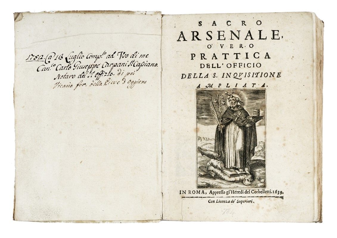 In-4° (mm 197 x 147). Pagine: [8], 384, [48]. Nota bene: SBN dice che il primo fascicolo è di 8 carte, ma ne presenta invece 4, come ben visibile nelle copie digitalizzate. Frontespizio con ampia vignetta calcografica che raffigura Pietro il Gran Martire, marca xilografica in fine. Pallide fioriture occasionali, piccola gora angolare intermittente, specchio di stampa brunito in un paio di fascicoli, qualche macchietta e altre trascurabili tracce del tempo. Pergamena flessibile coeva (spellature, mancanze e altri difetti).