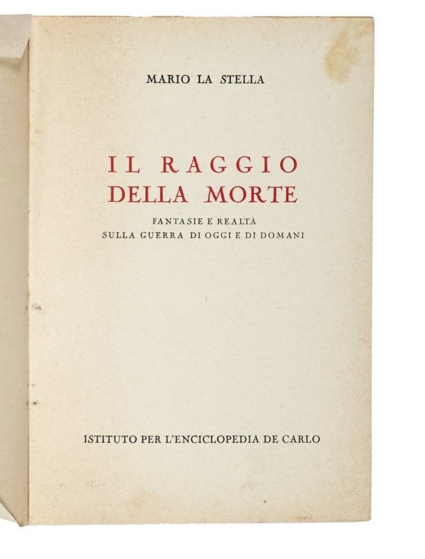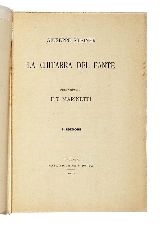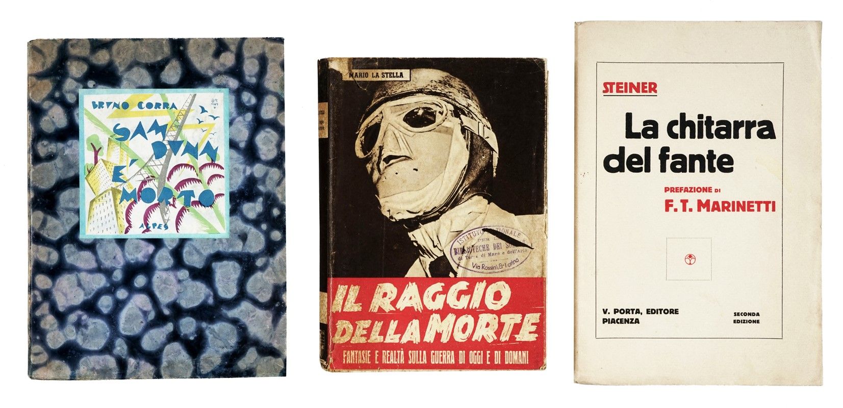In-8° (mm 207x152). Pagine 101, [3] con 7 tavole in bianco e nero su carta patinata fuori testo di Arnaldo Ginna. Rare fioriture marginali, altrimenti ottima copia, perfettamente conservata. Brossura editoriale con sovraccoperta marmorizzata, con un'illustrazione di Veneziani applicata al piatto anteriore. Bruniture da esposizione al dorso e qualche altro minimo difetto. SI AGGIUNGE: La Stella Mario, Il raggio della morte. Roma: De Carlo, 1942. Presente la rara sovraccoperta, con una mancanza marginale al piatto anteriore e alle cuffie. SI AGGIUNGE: Steiner Giuseppe, La chitarra del Fante [...]. II edizione. Piacenza: V. Porta, 1920.