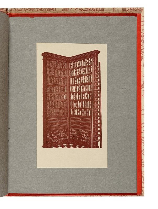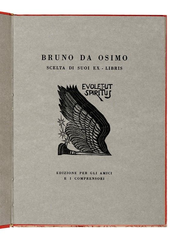 In-8° (mm 230x170). Con 39 ex-libris silografici applicati su carta forte da Bruno da Osimo «per gli amici e i comprensori». Legatura editoriale in pieno cartonato illustrato, con titoli su tassello al dorso; camicia editoriale in carta illustrata e segnalibro coordinato. Tracce di usura e ossidazione al dorso della camicia, altrimenti ottima copia. Dedica autografa dell'Autore a Adolf Vallaster, datata 1947. SI AGGIUNGE: Mistral Frédéric, Magalì. Dal provenzale [...]. Nuova traduzione di Mario Chini. Per la musica italiana di Oswaldo Minervini e per le silografie di Bruno da Osimo. [Ancona: Casa Stella Maris: 1937]. Brossura editoriale in cartoncino crespo illustrata ai piatti. Tiratura di 100 copie fuori commercio firmate da Bruno da Osimo al colophon.