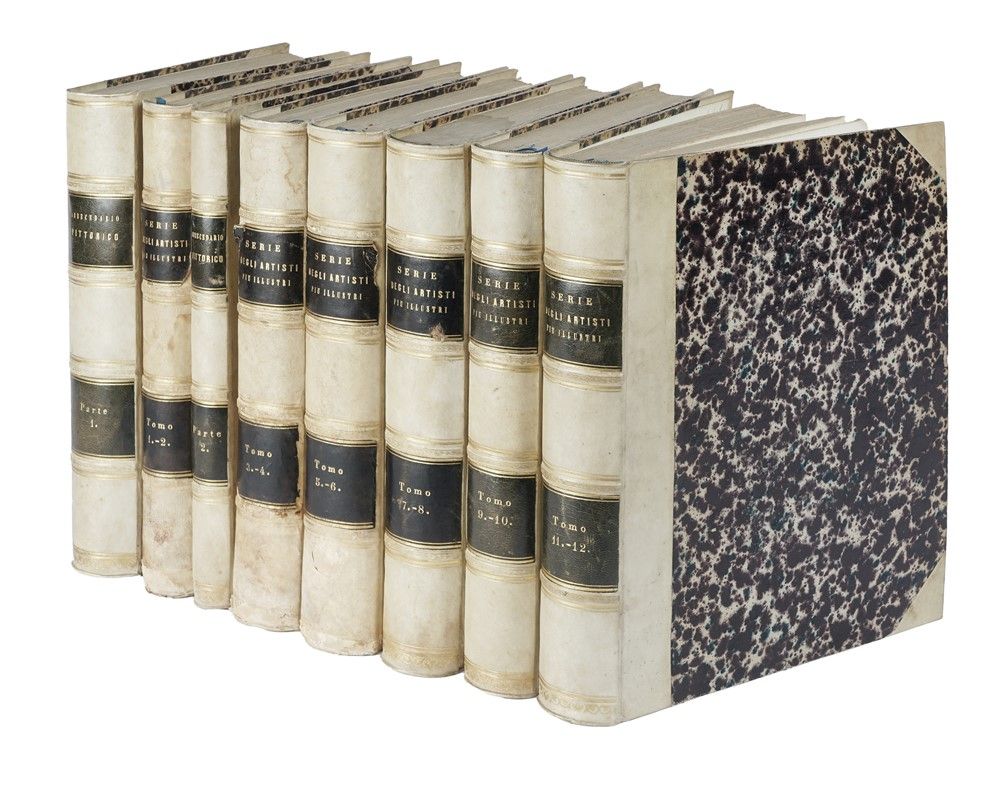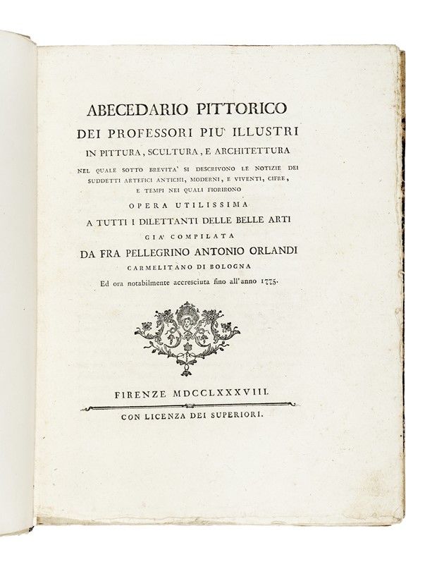 6 volumi in-4° (mm 283x210), in 12 tomi. Antiporta calcografica al primo volume. Fregi ai frontespizi e finalini xilografici. 300 tavole incise. Frontespizio del terzo volume quasi staccato. Marginali gore occasionali. Qualche macchiolina e fioritura sbiadite. Esemplare parzialmente in barbe. Mezza pergamena coeva, titoli dorati in tassello al dorso (piccoli difetti). SI AGGIUNGE: Orlandi Pellegrino Antonio, Abecedario pittorico dei professori piu illustri in pittura, scultura, e architettura. Firenze: [s.n.], 1788. Due volumi in-4° (283x210mm), in 2 parti. Fregio xilografico al frontespizio. 4 tavole calcografiche, tra le quali 1 ritratto dell'autore. Lievi fioriture occasionali. Mezza pergamena coeva, titoli dorati in tassello al dorso (piccoli difetti). Buone copie.