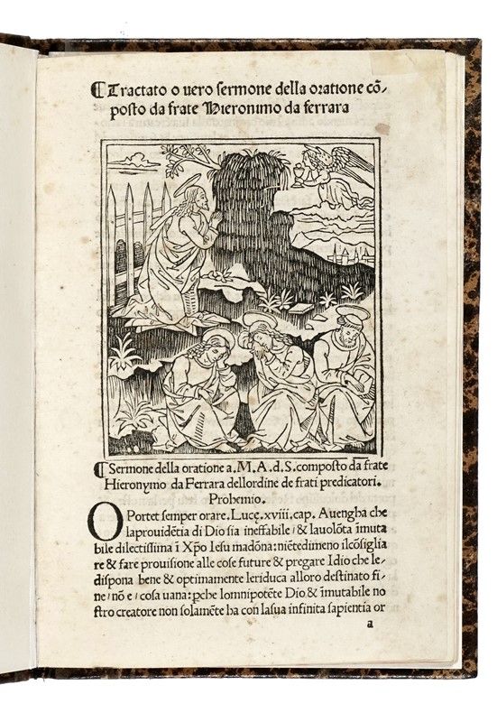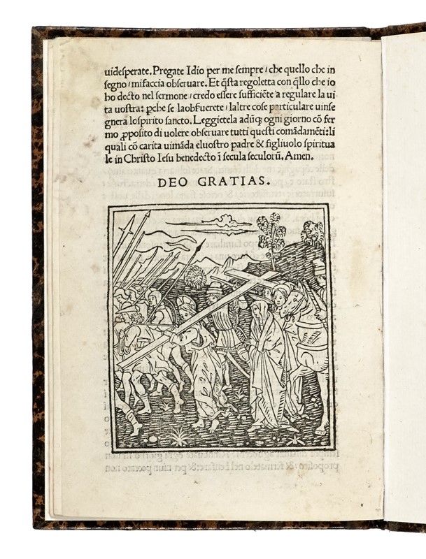 In-4 (mm 186x125). Carte: [14], collazionato completo. Le carte godono di buone condizioni se non per qualche macchiolina ai margini, leggerissime fioriture e un lieve restauro all'angolo superiore esterno della prima carta fuori testo. Alla prima e ultima carta sono presenti due eleganti xilografie di Cristo che prega al Getsemani e Cristo che porta la croce. Sguardie rinnovate e legatura in piena pelle moderna maculata, tagli spruzzati di rosso.