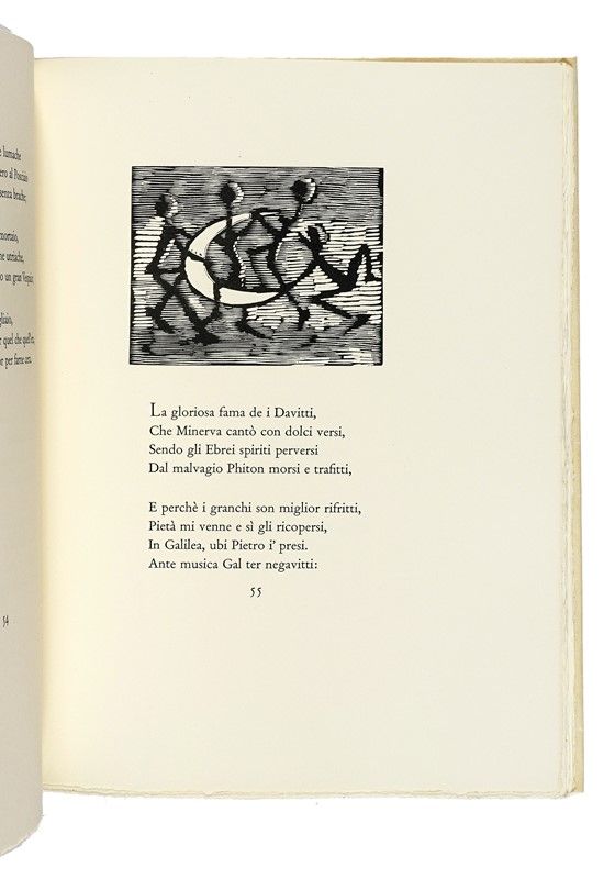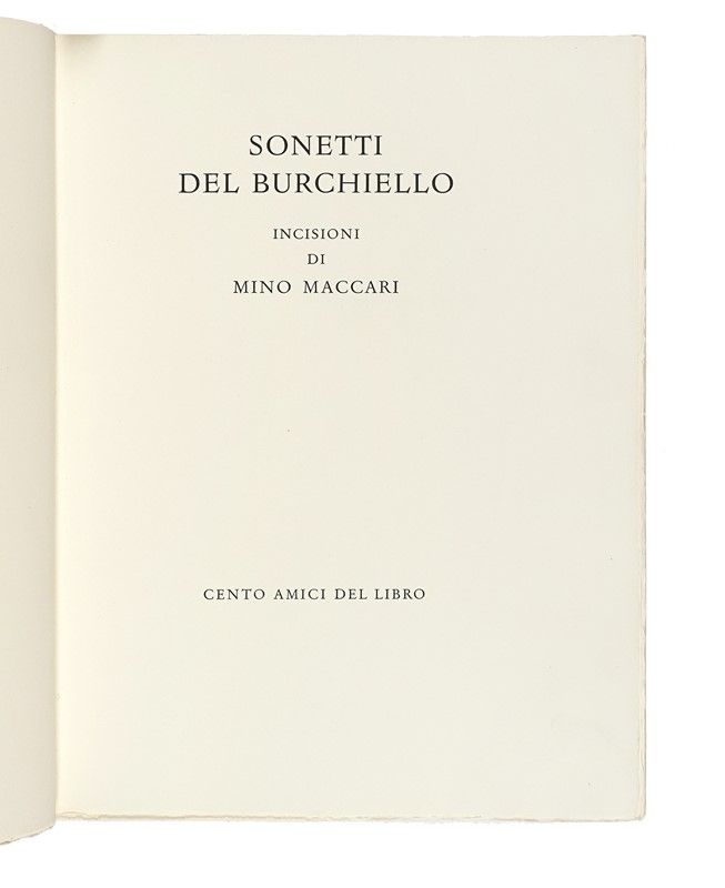 In-4° (mm 325x240). Con 45 incisioni di Mino Maccari nel testo, di cui 3 linoleografie policrome a piena pagina. Splendido esemplare in barbe. Brossura editoriale in carta avorio, con un'incisione in sanguigna al piatto anteriore e titoli in nero. Ricoperta con pergamino protettivo, entro custodia in pieno cartonato verde, che presenta ampie macchie e difetti ai tagli. Uno dei 100 esemplari ad personam in numeri romani, con firma del Presidente dell'associazione Sanminiatelli al colophon, su una tiratura complessiva a 120 copie su carta a mano dei Fratelli Magnani di Pescia.