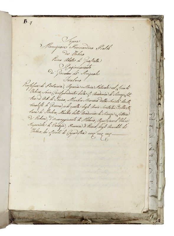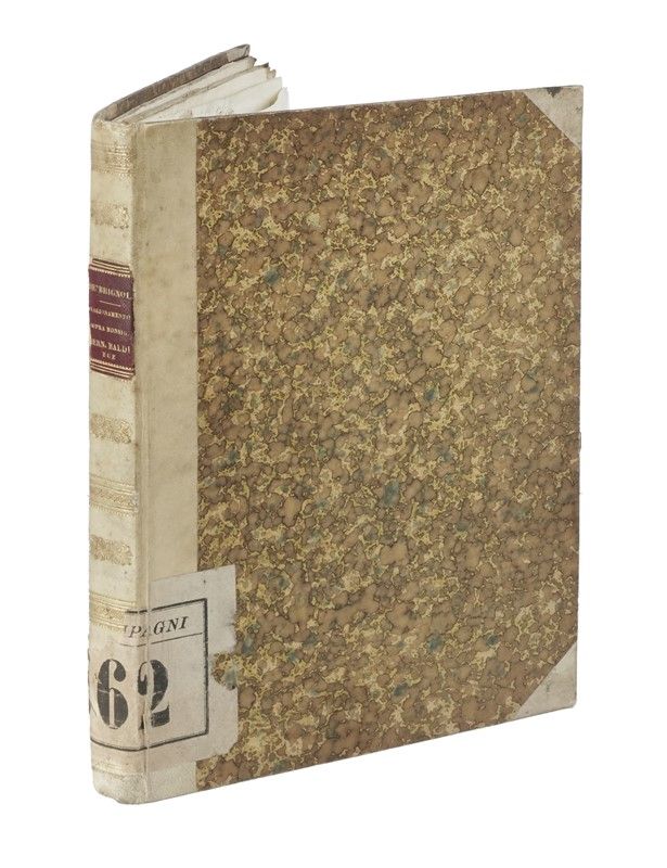 Manoscritti a inchiostro bruno. Carte 182. Legatura in mezza pergamena con angoli. Provenienza (come da tassello alla costola): Biblioteca Boncompagni. L’intera biblioteca venne venduta all’asta nel gennaio-febbraio 1898 (Roma, Palazzo Cenci. Perito giudiziario Silvio Bocca). Dimensioni del volume: 300x210 mm.