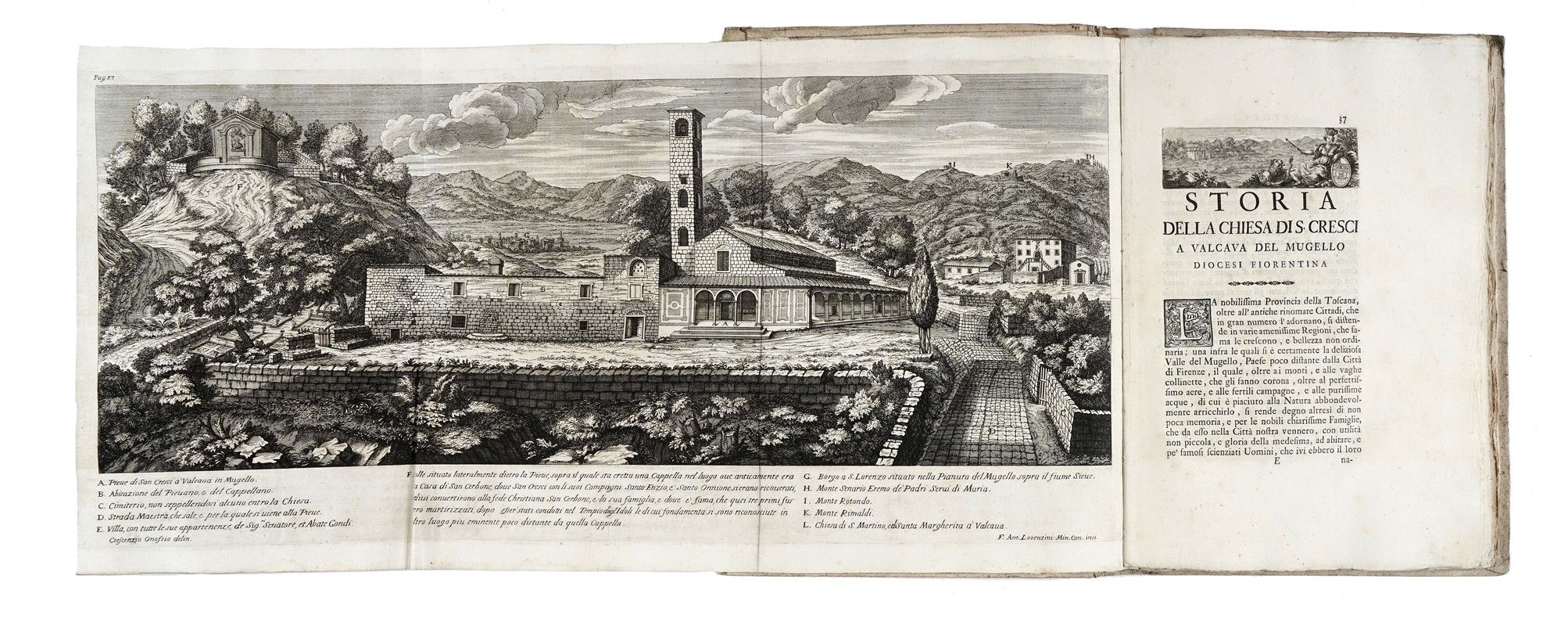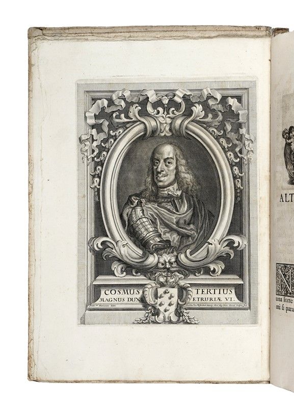 In-folio (mm 380x264). Pagine: [14], XXVII, [3], 180, [2]. Segnatura nella variante B. Illustrato da [8] tavole calcografiche, di cui una ripiegata. Splendida antiporta incisa da Theodor Verkruys su disegno di Tommaso Redi, seguita da frontespizio con emblema calcografico dell’Accademia della Crusca, da ritratto del dedicatario Cosimo III de’ Medici (1642-1723), inciso da Arnold Van Westerhout su disegno di Francesco Petrucci, grande testatina calcografica con armi medicee, ed altre testatine e vignette calcografiche. Alcune trascurabili tracce del tempo. Cartonato d'attesa coevo con titoli manoscritti al dorso.