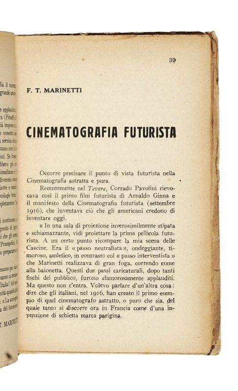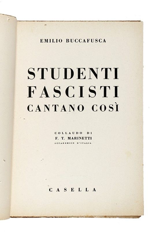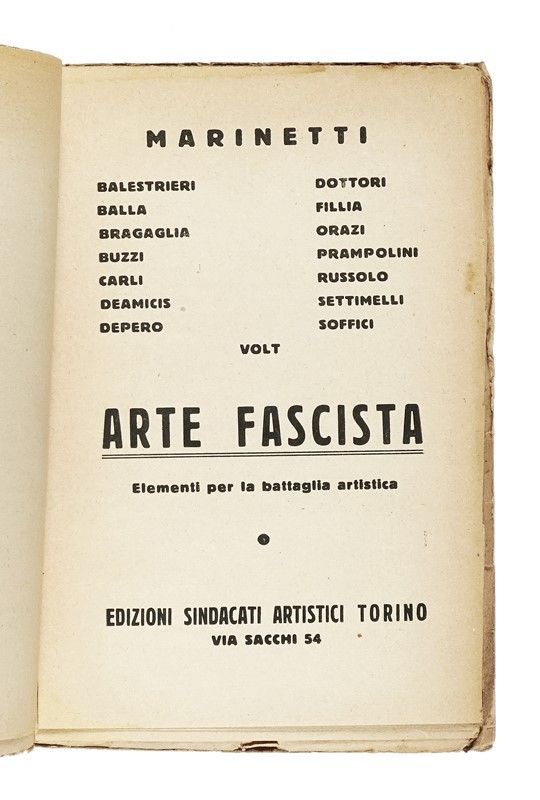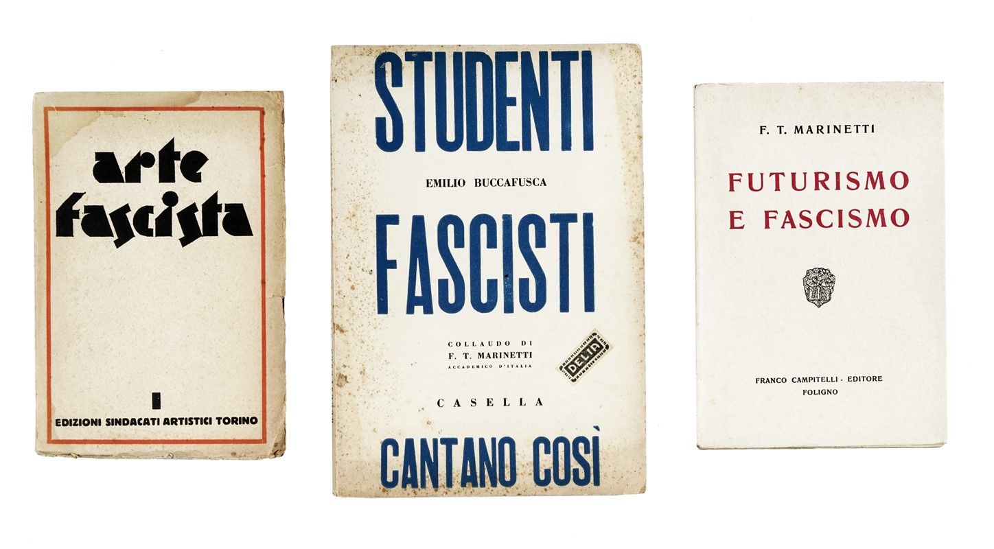 In-4° (mm 245x172). Pagine XXIII, [1], 87, [1]. Forellini senza perdite, altrimenti ottimo copia. Annotazioni a matita nel testo. Brossura editoriale con titoli in blu e nero al piatto anteriore e al dorso, con pecetta "Delia" applicata al piatto. Fioriture marginali, ma nel complesso ottima conservazione. SI AGGIUNGE: Marinetti Filippo Tommaso, Futurismo e Fascismo. Foligno: Campitelli, 1924. In-8° (mm 195x149). Esemplare intonso. Brossura editoriale con titoli in rosso e nero al piatto anteriore; leggermente staccata la parte anteriore interna, ma nel complesso ottima conservazione. SI AGGIUNGE: Id., Arte fascista. Elementi per la battaglia artistica. Torino: Edizioni Sindacati Artistici, s.d. [i.e. 1927]. In-8° (mm 200x135). Brossura editoriale con titoli in nero entro cornice tipografica rossa. Ampia gora, una piccola mancanza alla cuffia, strappetti alle cerniere e all'unghiatura di entrambi i piatti, che si conserva comunque ampia.