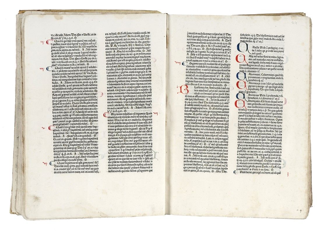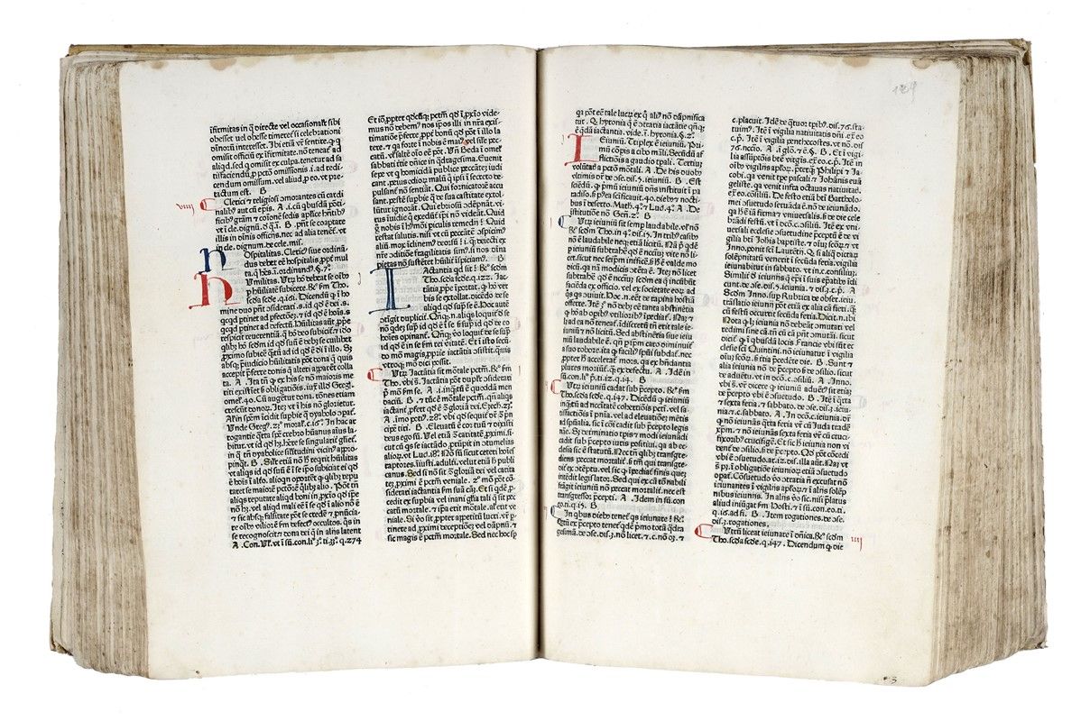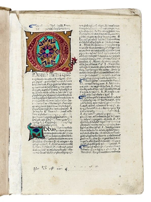 In-folio (mm 250x180). Carte: [322, di 336?], incipit in facsimile e altra carta mancante dal fascicolo a, assente il fascicolo finale con il colophon. Segnatura in mano coeva: [a-k10 l-m8 n-q10 r8 s-z10 A-G10 H8 I12 K10]. La segnatura più simile che si sia trovata è quella dell'edizione stampata a Venezia da Renner nel 1474 (identica, ma con un ulteriore fascicolo L12). Tuttavia, la copia digitalizzata è molto simile ma non perfettamente corrispondente alla presente. Testo in romano su due colonne con numerosissime iniziali miniate in rosso o in blu e con ulteriori piccole decorazioni in giallo. Due carte con il margine inferiore rifilato, qualche gora e alone marginale, e altri minimi difetti, ma internamente molto fresco. Pergamena semi-flessibile posteriore. Conservato in cartellina moderna copiosamente annotata al suo interno da studioso novecentesco.