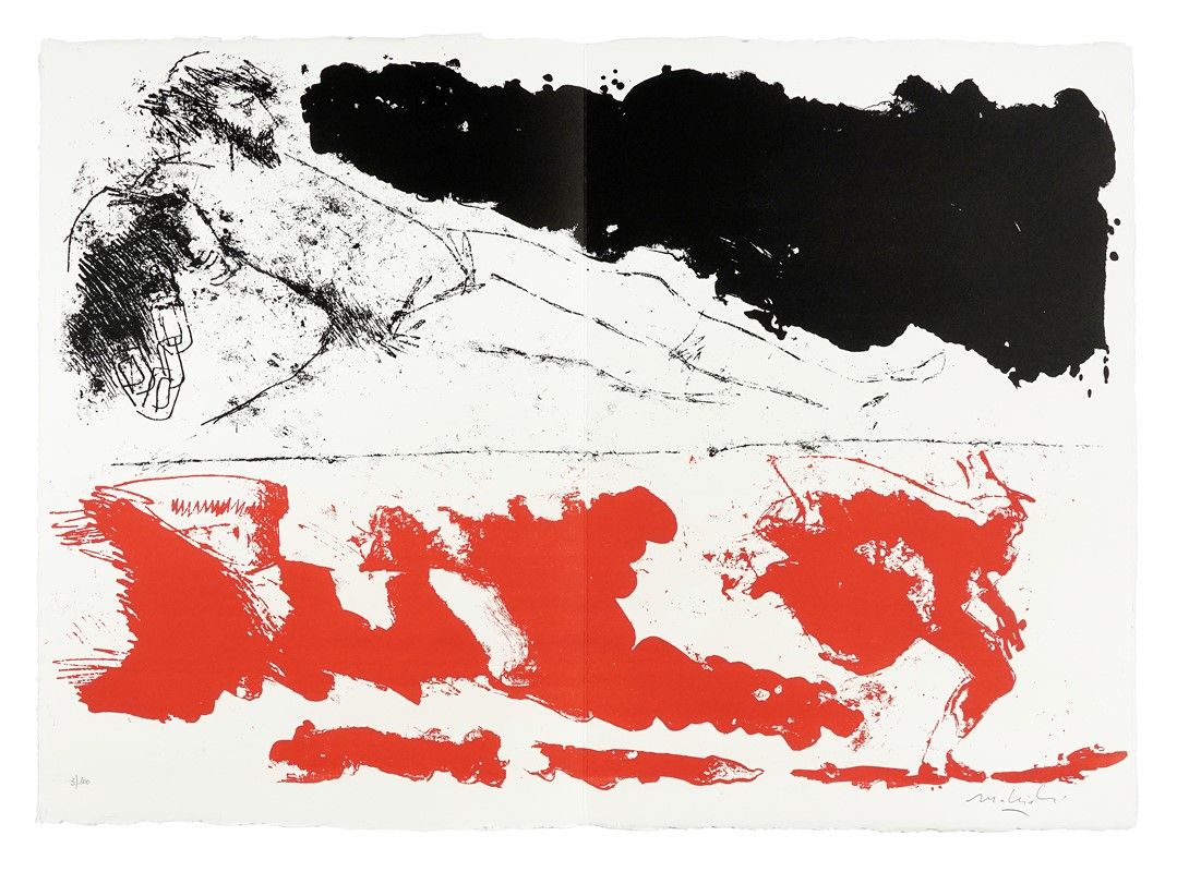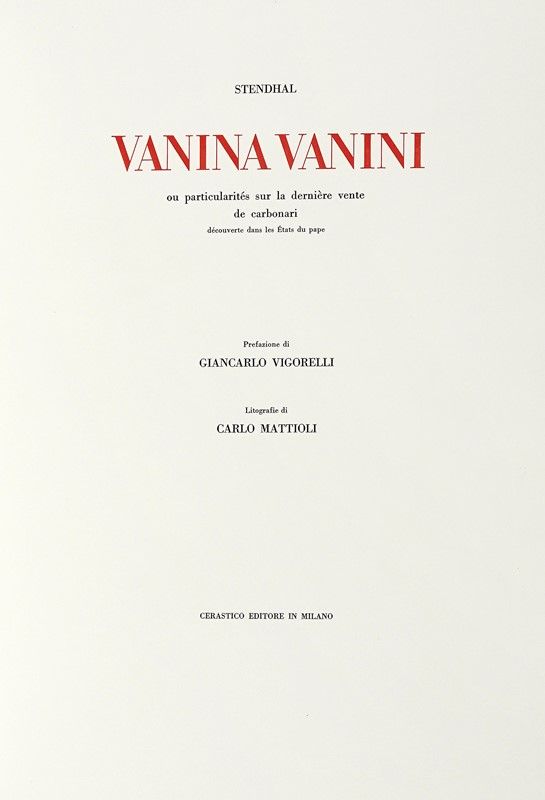 In-folio (mm 440x315). Esemplare a fogli sciolti, perfettamente conservato nelle sue barbe, con 10 litografie originali a colori di Carlo Mattioli, di cui 9 nel testo numerate e firmate a matita dall'Artista. Entro cofanetto editoriale in piena tela rossa, con titoli in nero al dorso e un'illustrazione di Mattioli al piatto anteriore. Lievi segni di usura, ma nel complesso buona conservazione.