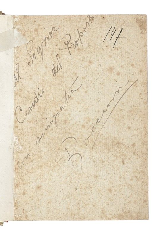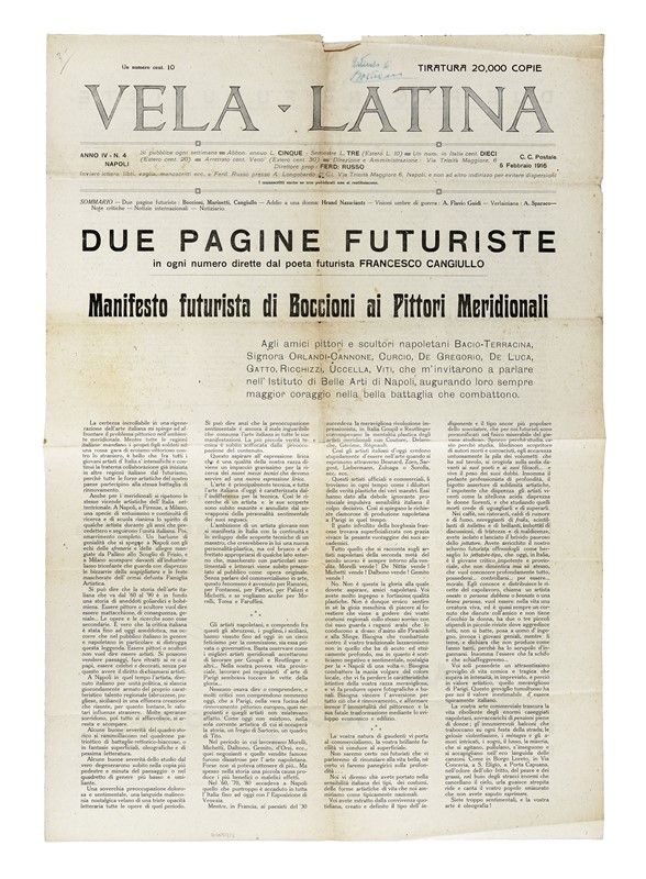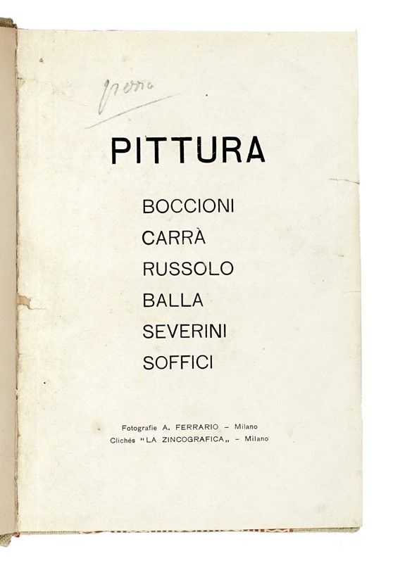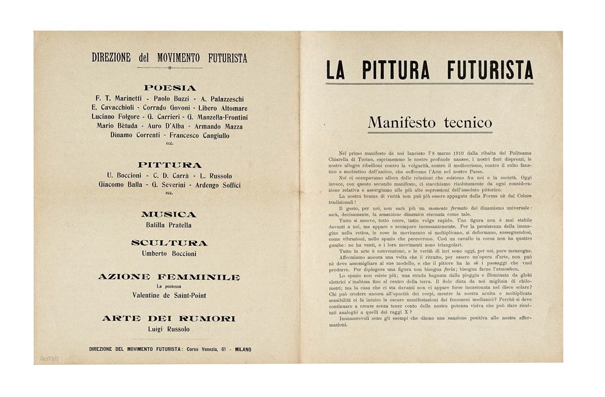 In-folio (mm 628x 436). Carta [1] stampata recto-verso. Esemplare fiorito, con strappetti marginali e lievi bruniture ai punti di antica piegatura. Annotazione manoscritta al recto e due splendide parole in libertà di Marinetti e Cangiullo al verso. SI AGGIUNGE: Id., Pittura scultura futuriste (dinamismo plastico) con 51 riproduzioni, quadri, sculture di Boccioni, Carrà, Russolo, Balla, Severini, Soffici. Milano: Edizioni Futuriste di Poesia, 1914. In-16° (mm 186x135). Pagine [8], 469, [3] (di 5) con 1 ritratto fotografico di Boccioni in antiporta e 6 (di 51) riproduzioni in bianco e nero di quadri e sculture su carta patinata. Rinforzi marginali all'occhietto, al ritratto e alle pagg. da 465 in poi; maldestri restauri ad alcune carte. Esemplare rifilato, con fioriture sparse. Mancanti 45 (di 51) tavole in bianco e nero fuori testo. Legatura successiva in mezza tela, con titoli in oro su tassello al dorso e sguardie rinnovate; entro cofanetto in cartonato, con la scritta Boccioni applicata al dorso. Ex-libris cartaceo al contropiatto anteriore e al recto del ritratto dell'Autore. Dedica autografa di Umberto Boccioni. Esemplare da studio. SI AGGIUNGE: Id., La pittura futurista. Manifesto tecnico. Milano: Poligrafia italiana, 11 aprile 1910. In-4° (mm 290x230). Carte [2]. Segno centrale di precedente piegatura e lievissimi strappetti marginali, altrimenti ottima conservazione.