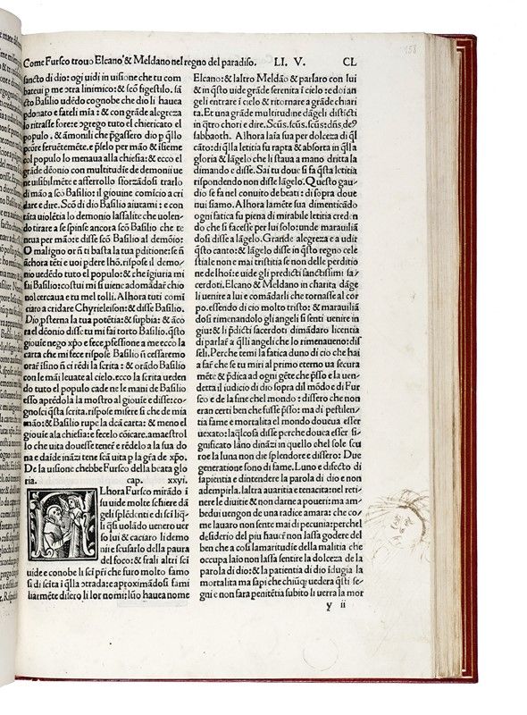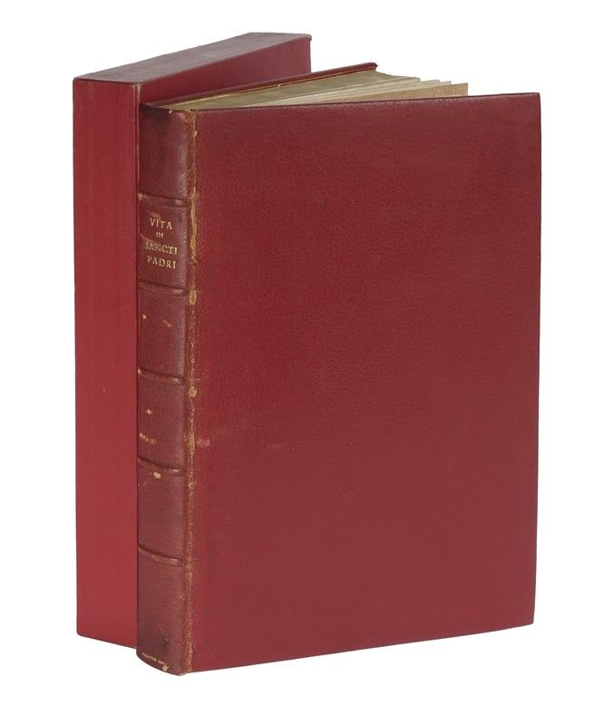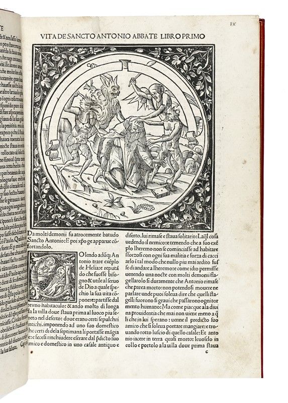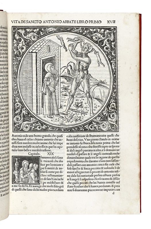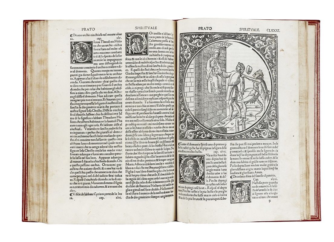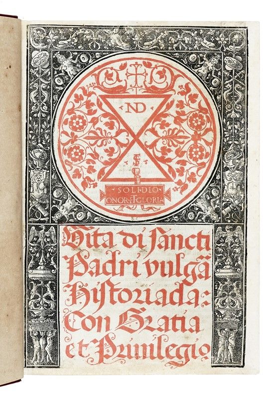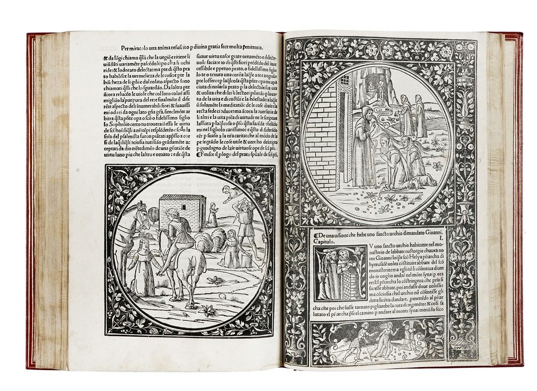 In-folio (mm 300x205). Carte: CLXXVIII [i.e. CCXXXVI], [10]. Frontespizio xilografico stampato in rosso e nero, marche di Niccolò e Domenico del Gesù sul frontespizio e di Otino Luna al verso dell'ultima carta, 36 grandi tondi xilografici entro cornici decorative su fondo nero o criblé, numerosissime iniziali xilografiche figurate su fondo nero, testo in tondo su due colonne. Minime tracce del tempo (qualche piccolo restauro molto ben fatto, qualche macchietta). Disegnino in margine alla carta CL. Ottima copia in marocchino rosso moderno con titolo in oro al dorso, triplo filetto dorato alla dentelle, tagli dorati, custodia in tela rossa (cerniera anteriore un po' sbucciata, dorso un po' stanco).