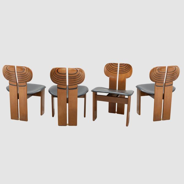 Italia, anni 70 quattro sedie mod. Africa in legno, ottone e pelle imbottita, marchio della produzione, lievi usure. Bibliografia: R. Masiero, Afra e Tobia Scarpa, p. 28, Electa, 1998; M. Mastropietro, Un’industria per il design La ricerca, i designers, l’immagine B&B Italia, Lybra Immagine, 1986, pag. 392-393