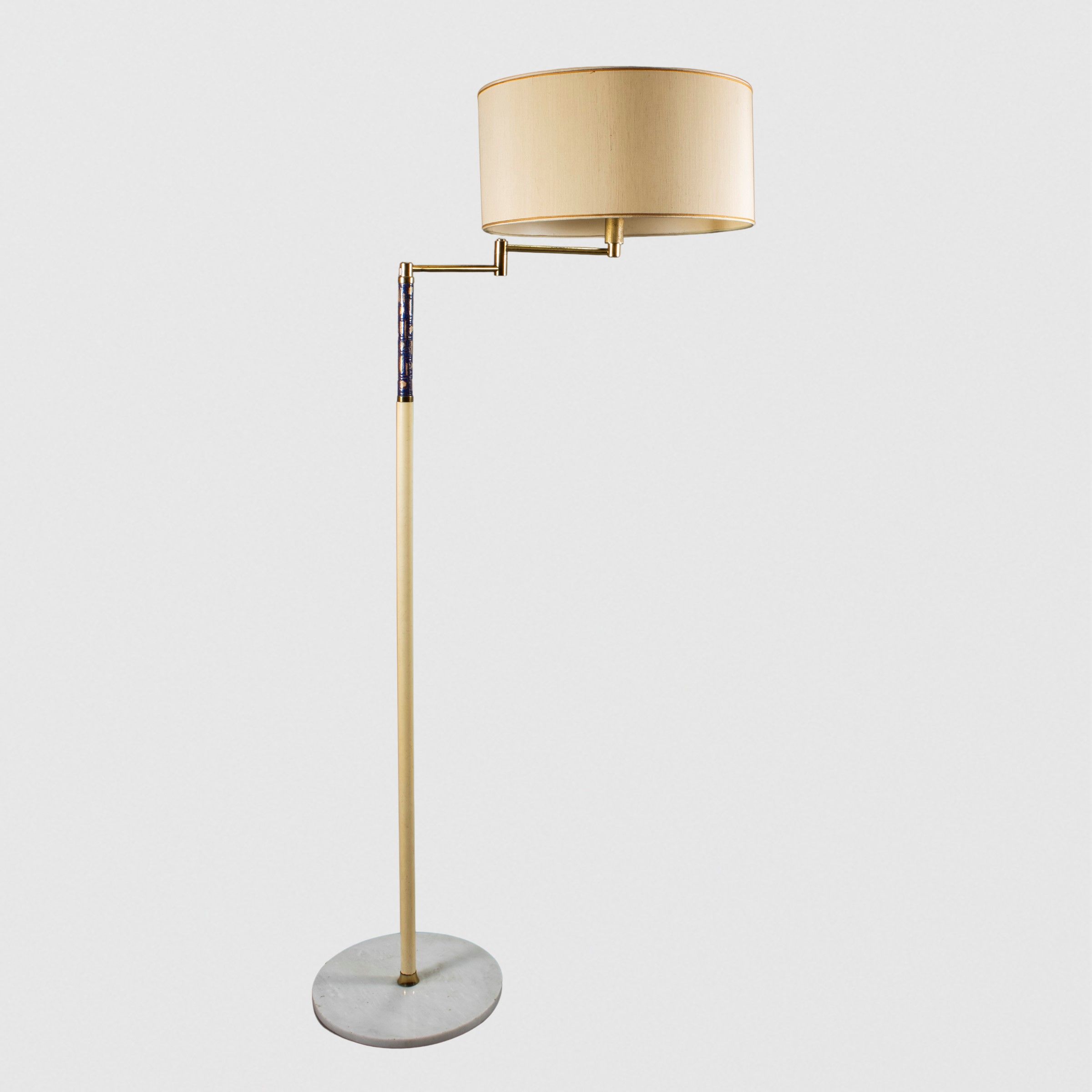 Italia, anni 60 lampada da terra orientabile in metallo verniciato, ottone, ceramica policroma e base in marmo, completa di paralume, lievi usure