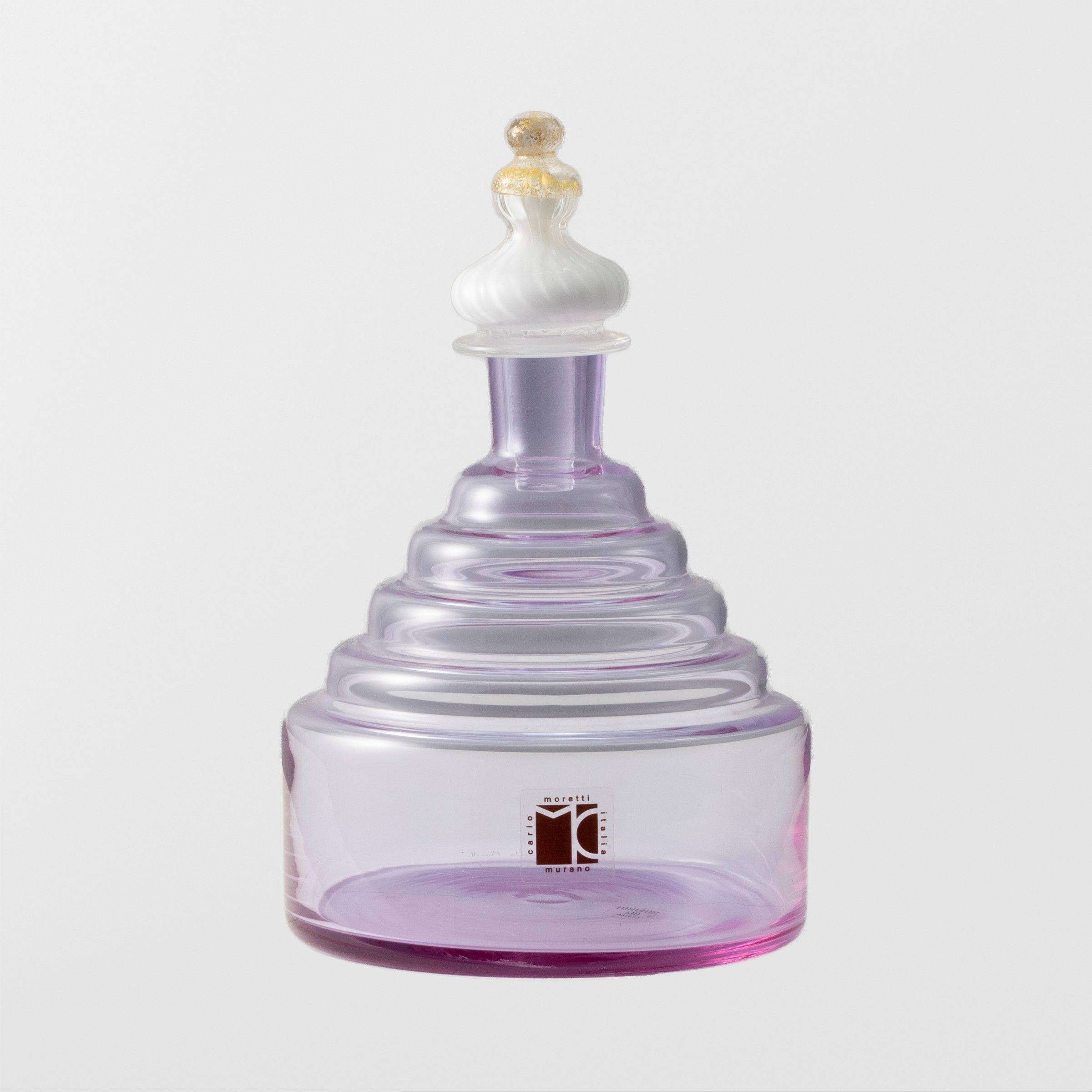 Murano, anni 70-80 bottiglia in vetro soffiato colorato, vetro lattimo e foglia d'oro, etichette della produzione
