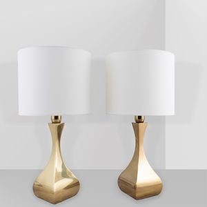 h. 55 cm. Italia, anni 70 coppia di lampade da tavolo in ottone, complete di paralumi, lievi usure