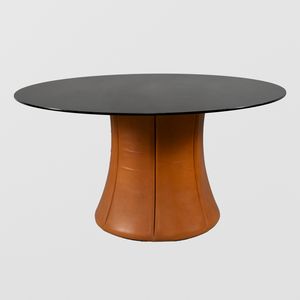 76x140 cm. Italia, anni 60-70 tavolo circolare in cuoio e vetro fumè, marchio della produzione, lievi difetti