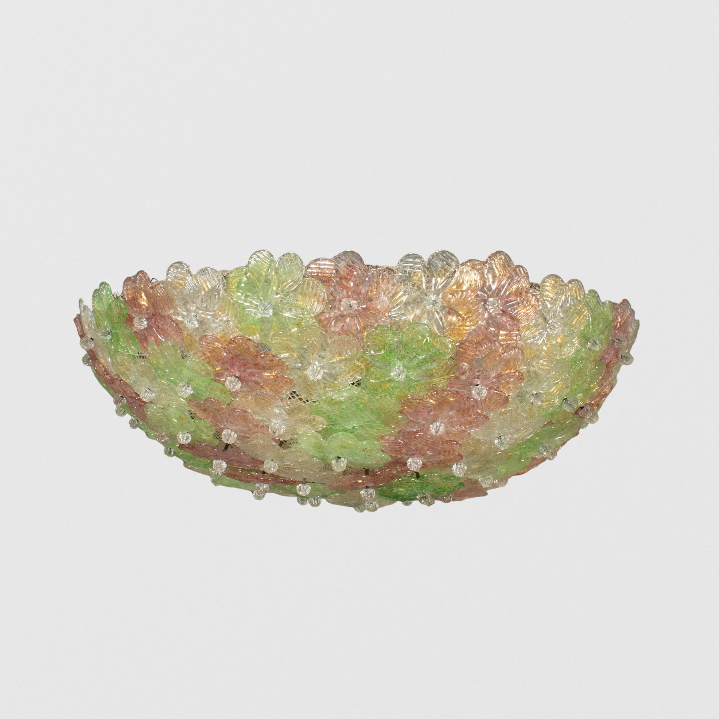 Murano, anni 50-60 lampada da soffitto in metallo e fiori in vetro soffiato trasparente e colorato, lievi difetti