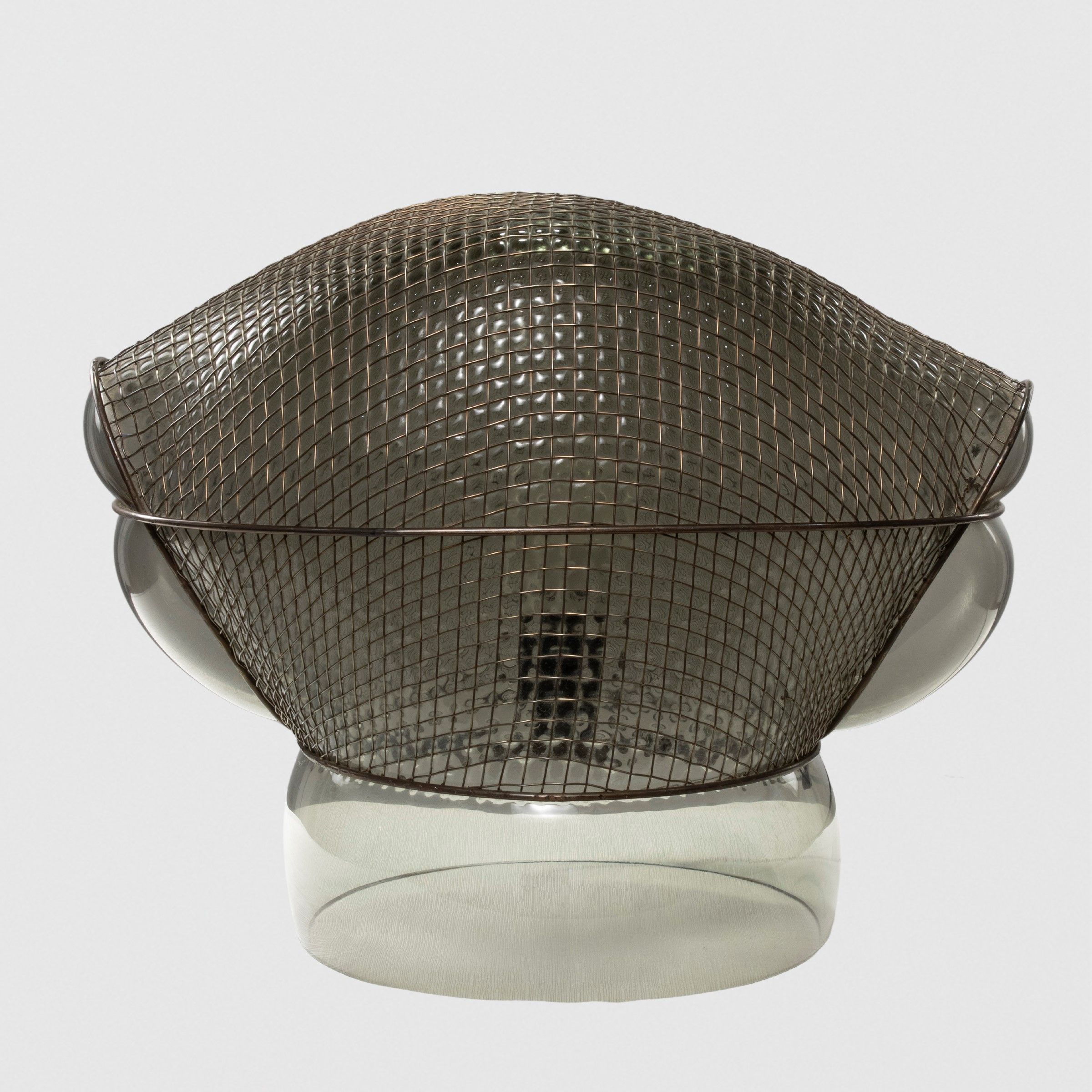 Italia, anni 70 lampada da tavolo mod. Patroclo, in vetro soffiato trasparente e rete metallica. Bibliografia: Giuliana Gramigna, Repertorio 1950-1980, Mondadori, Milano, 1985, pag. 420; Charlotte & Peter Fiell, 1000 lights 1960 to present, Taschen, Koln, 2005, pag. 272-273; Marco Romanelli, Il vetro progettato. Architetti e designer a confronto con il vetro quotidiano, Electa, Milano, 2000, pag. 66.