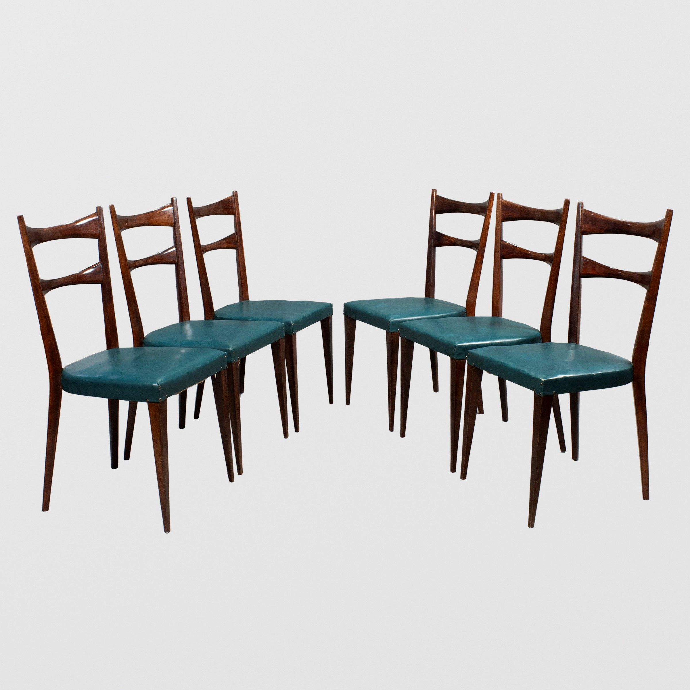 Italia, anni 50 sei sedie in legno e vinilpelle imbottita