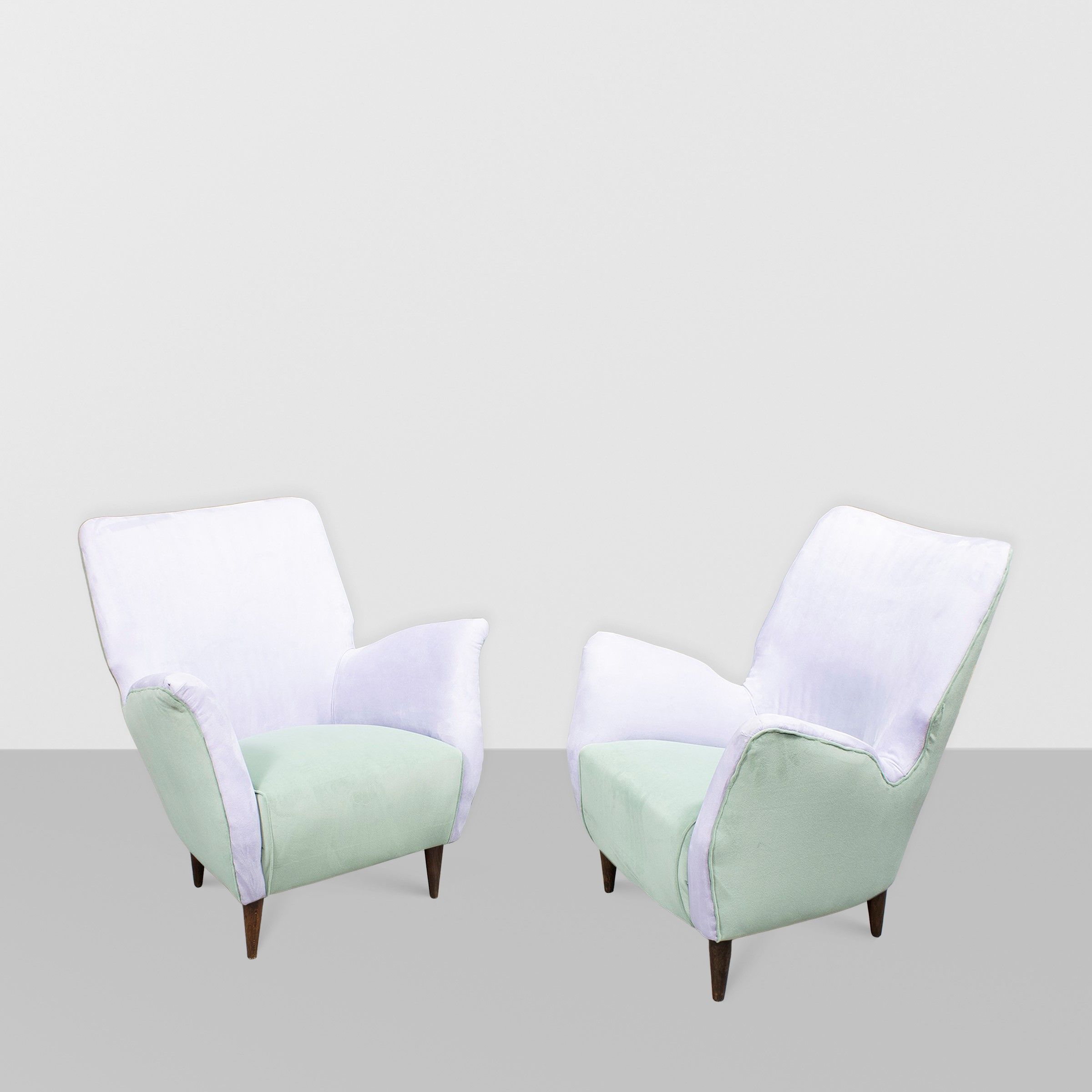 Italia, anni 50 coppia di poltrone in tessuto imbottito e legno