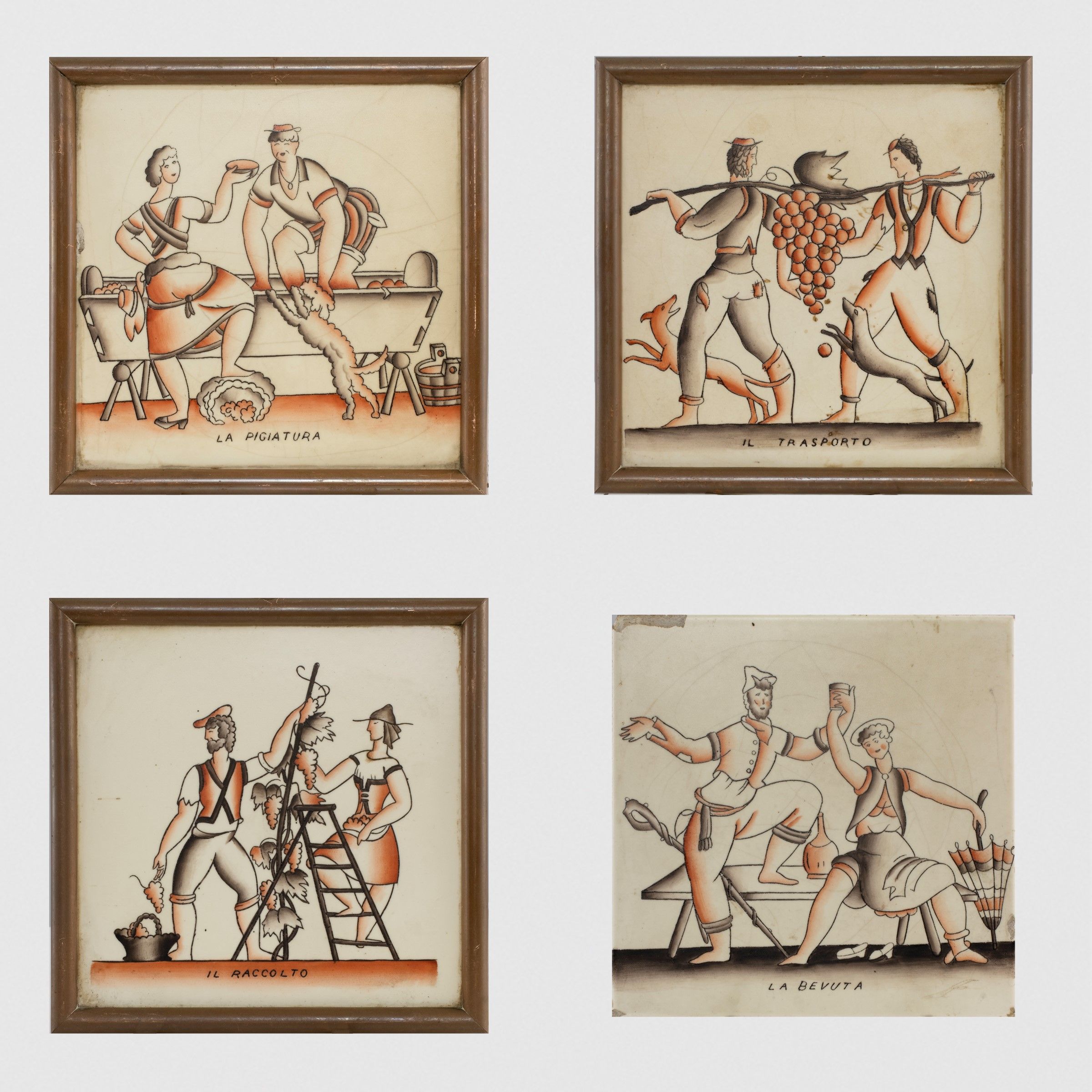Italia, 1935 circa quattro piastrelle in terraglia raffiguranti i lavori della vendemmia: Il Trasporto, Il Raccolto, La Pigiatura e La Bevuta, marchio della produzione, difetti