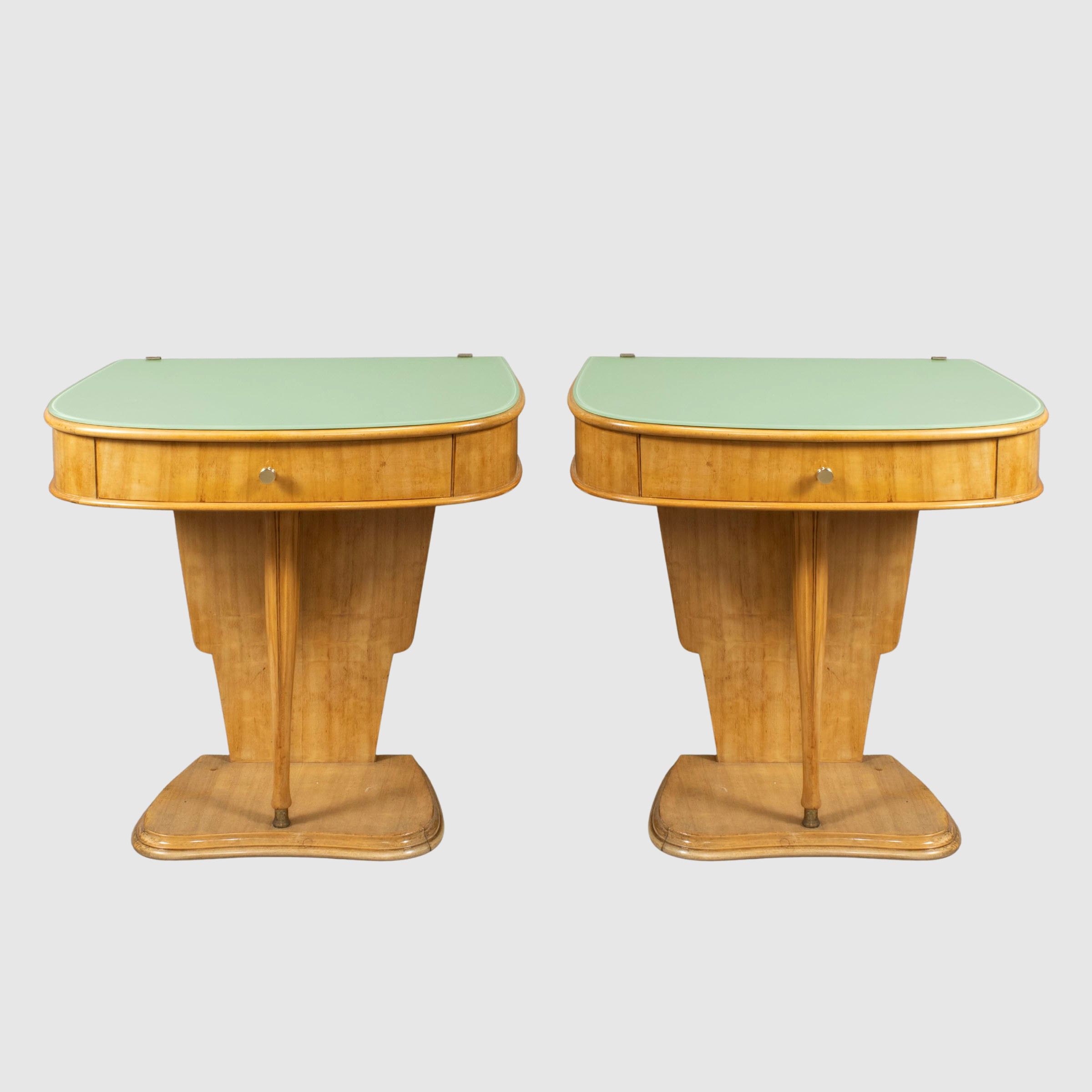 anni 50 coppia di comodini in legno, ottone e vetro colorato