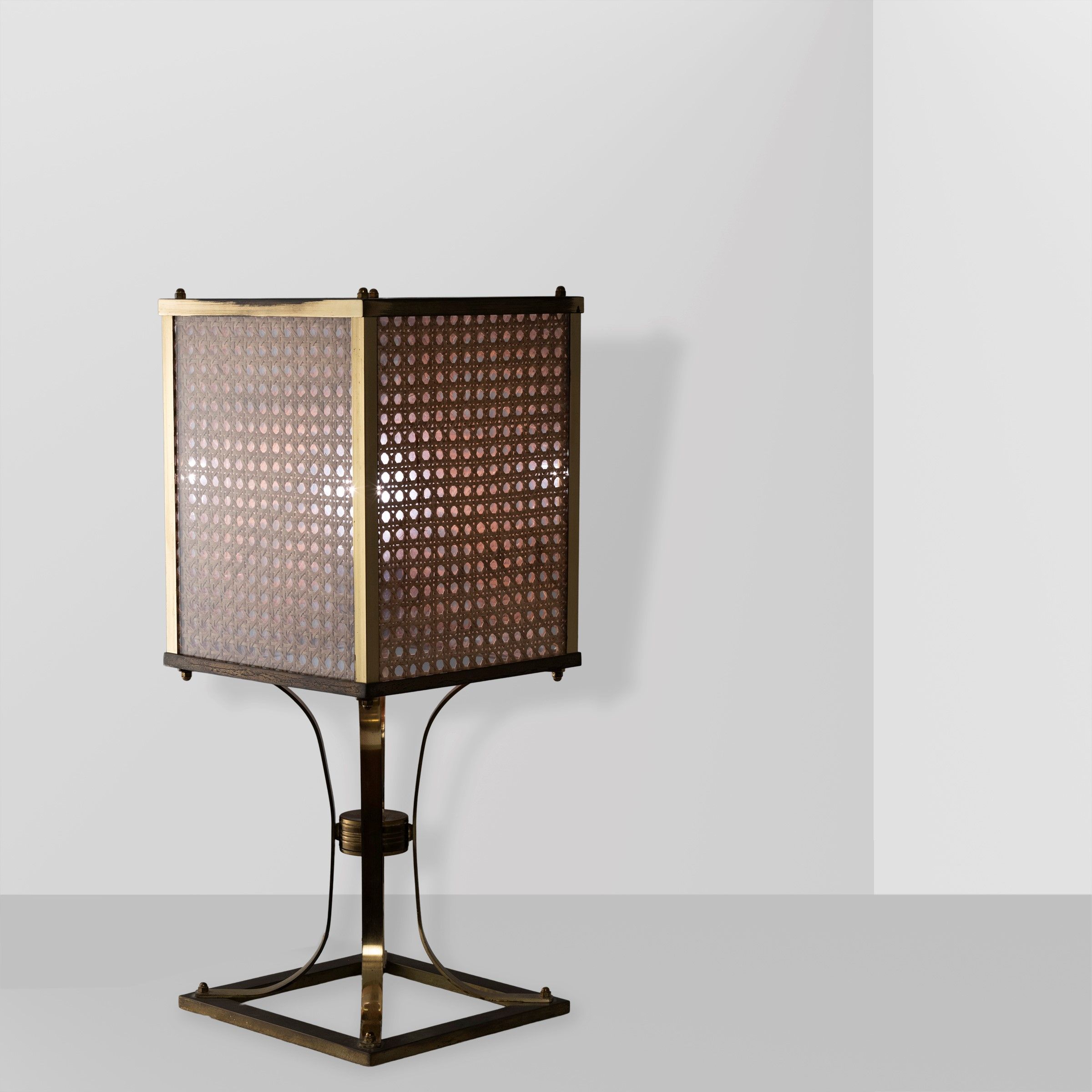 anni 70 lampada da tavolo in ottone, vetro trasparente e paglia di Vienna, lievi usure