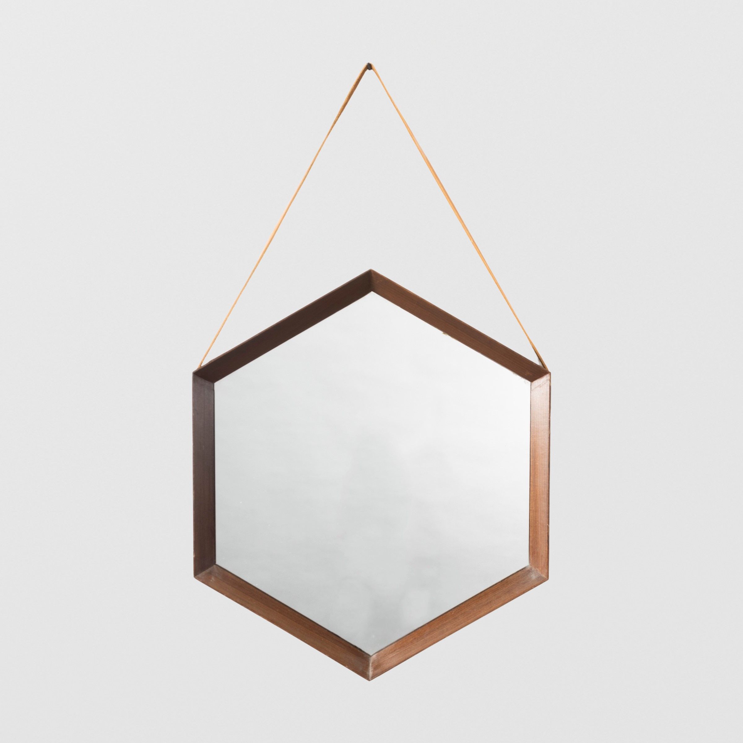 anni 60 specchio da parete in legno, vetro specchiato e pelle, lievi usure