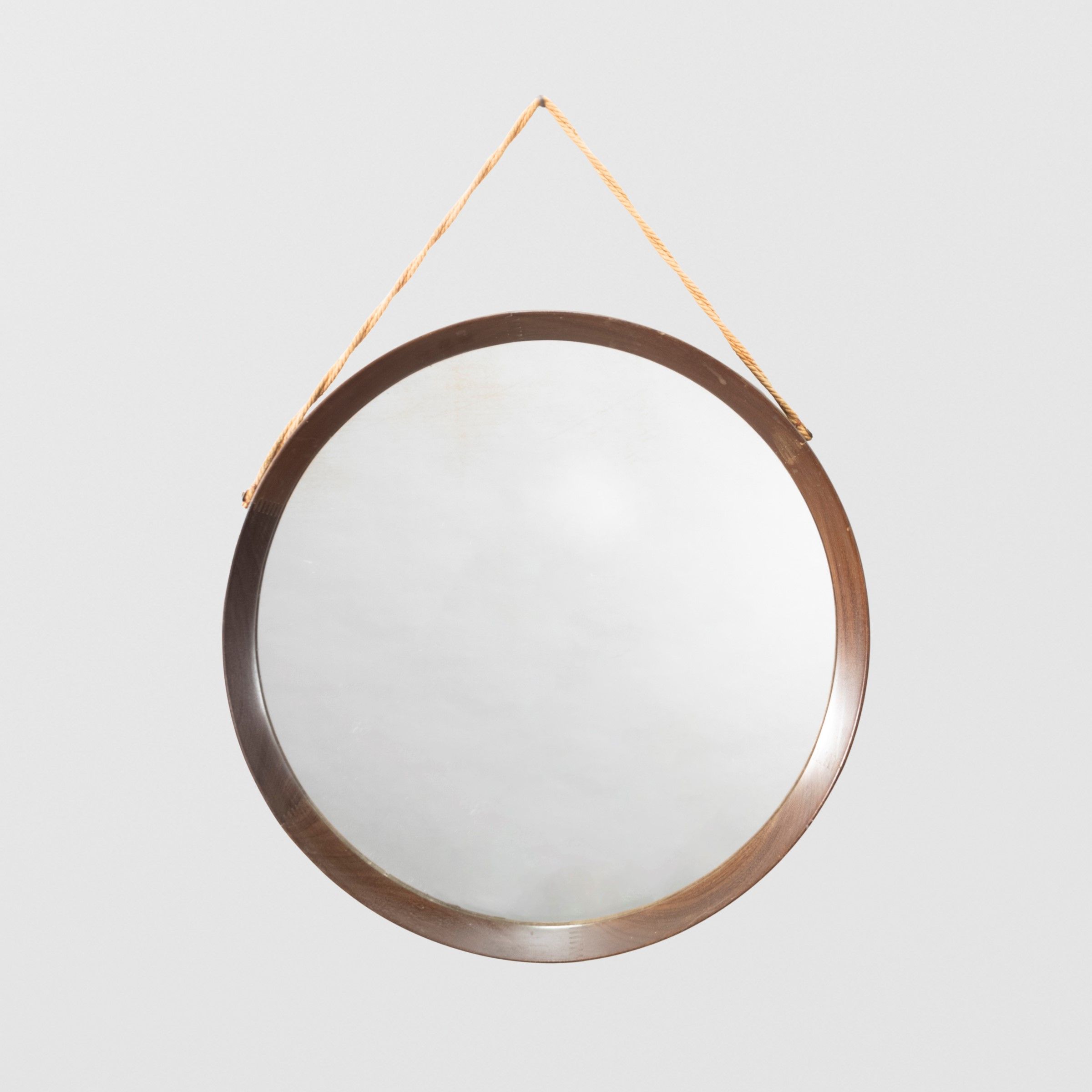 anni 60 specchio da parete in legno, vetro specchiato e corda, lievi usure
