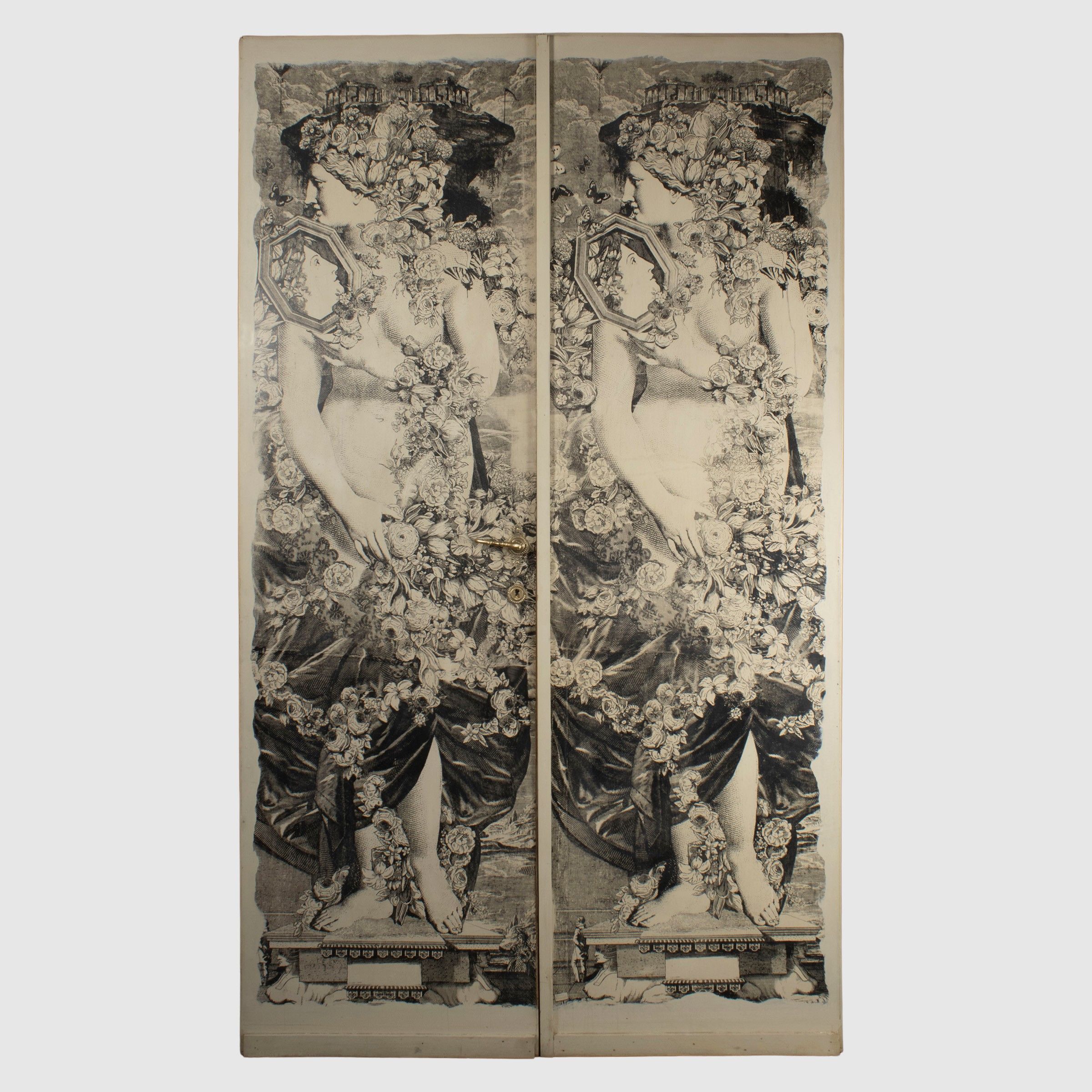 Italia, anni 40-50 porta a due ante con pannelli serie Venere Inghirlandata in legno serigrafato ed ottone, uno firmato, lievi difetti