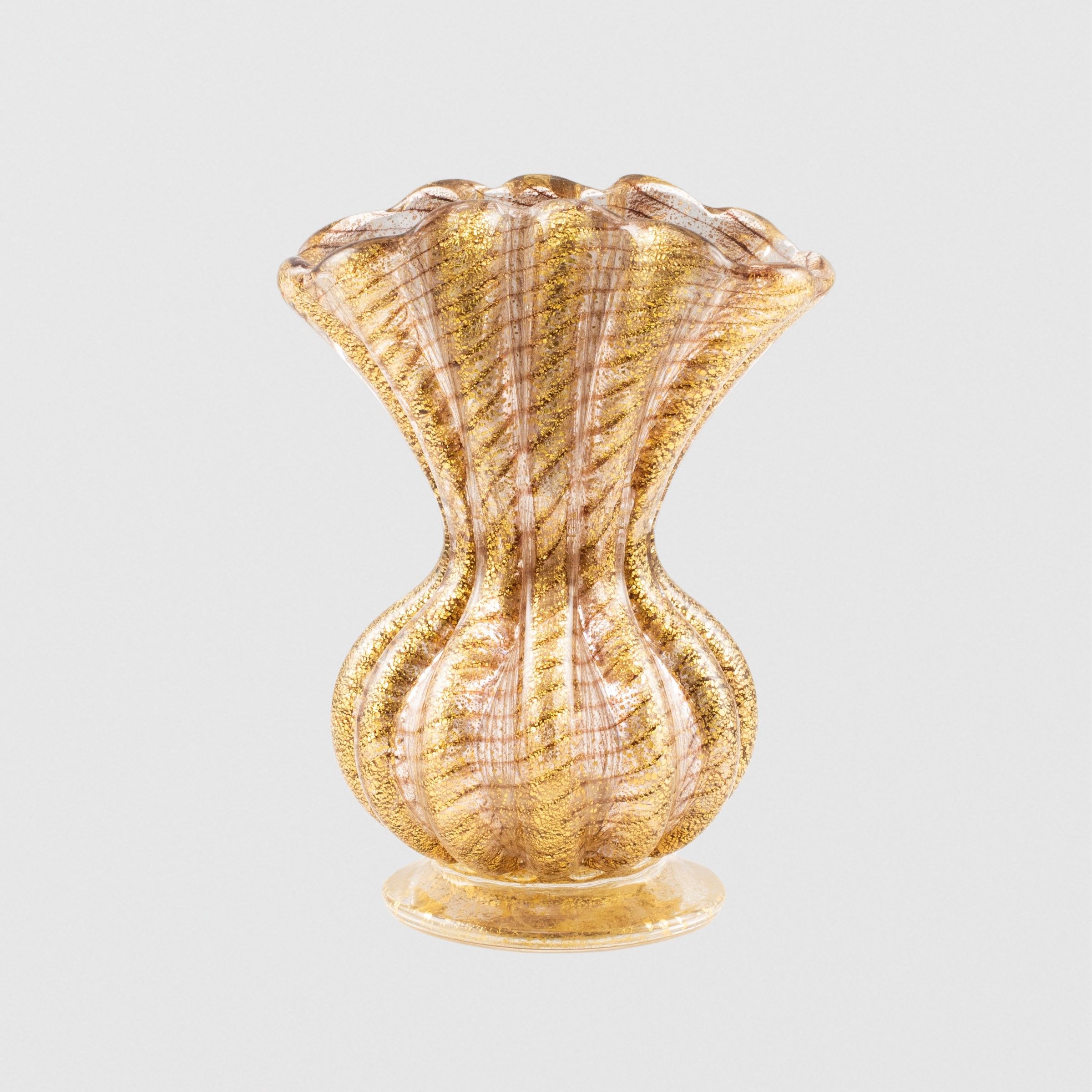 Murano, anni 50 piccolo vaso in vetro soffiato colorato e foglia d'oro, etichetta della produzione