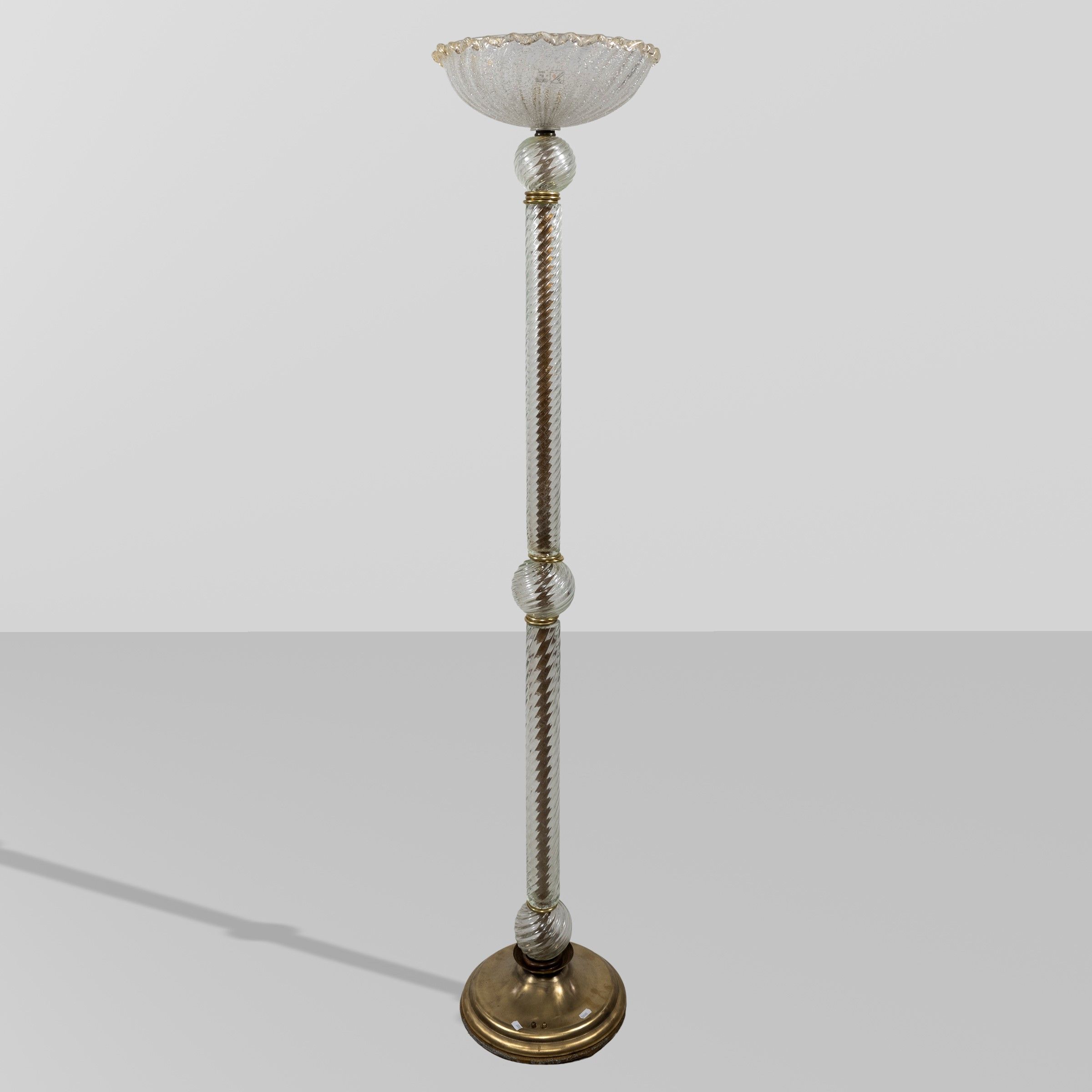 Murano, anni 40-50 lampada da terra in vetro trasparente ed ottone, etichetta della produzione