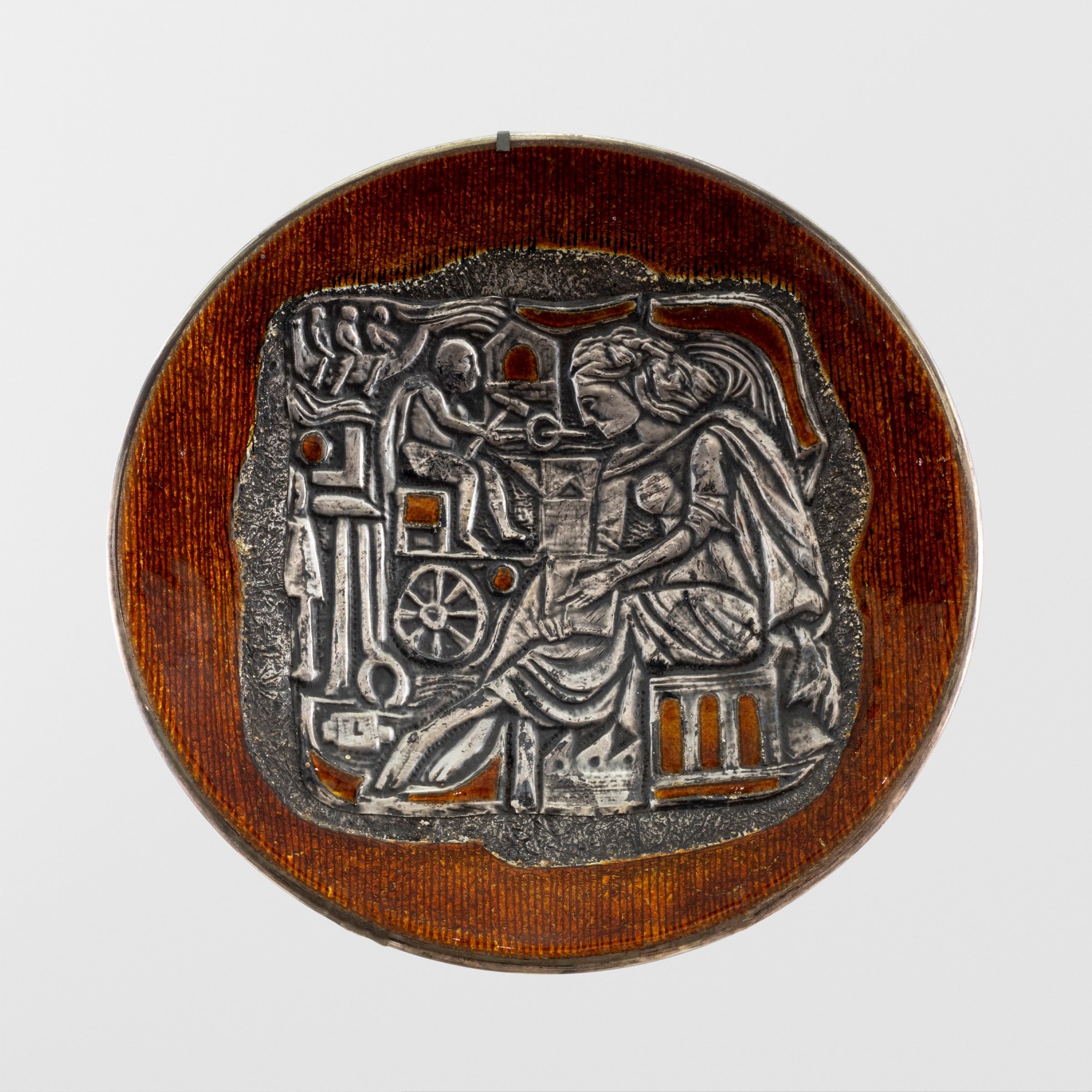 Italia, anni 70 piatto in metallo argentato e smalto, ed. 39/50, marchio della produzione