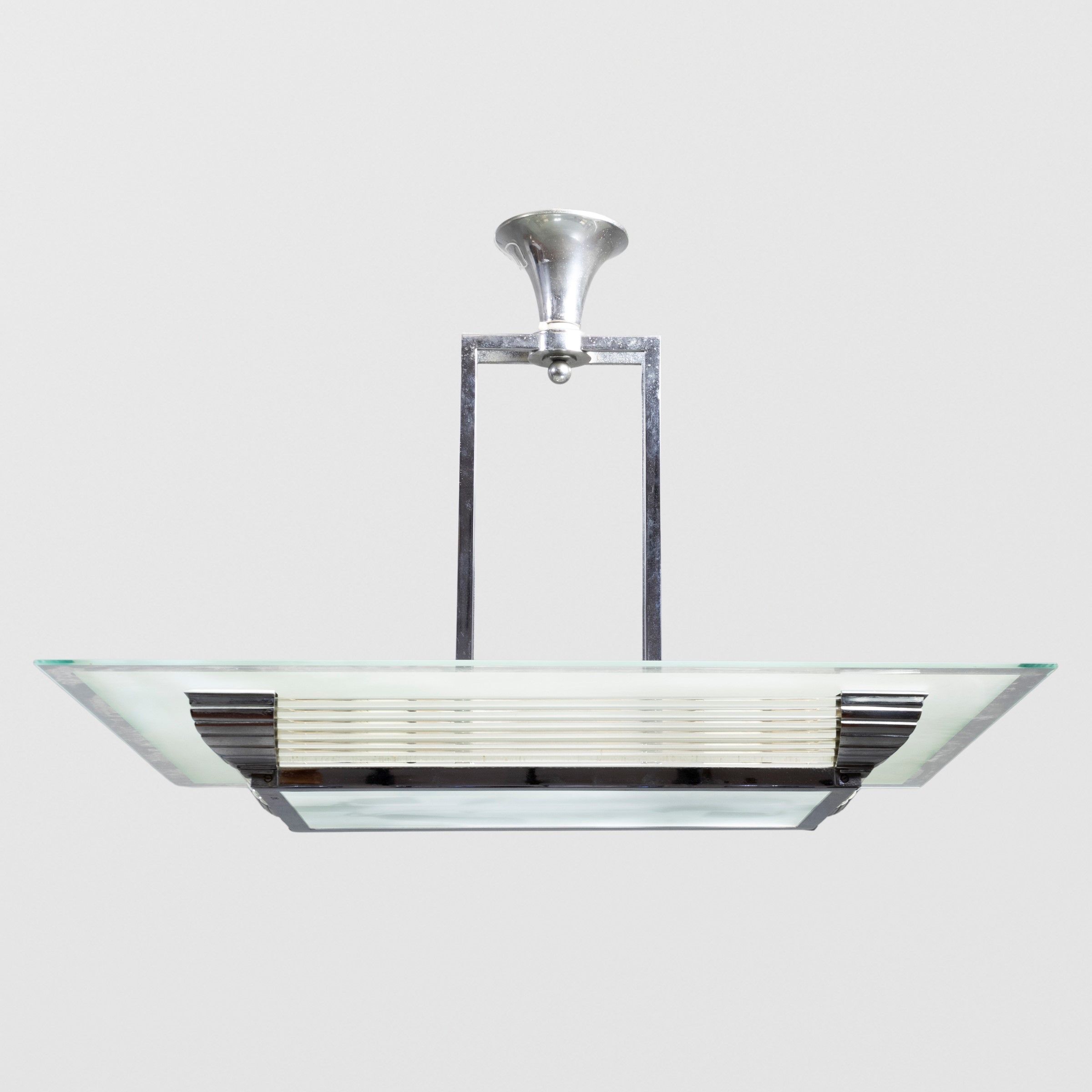 Francia, anni 30 lampada a sospensione in acciaio cromato, vetro trasparente e vetro satinato, lievi mancanze