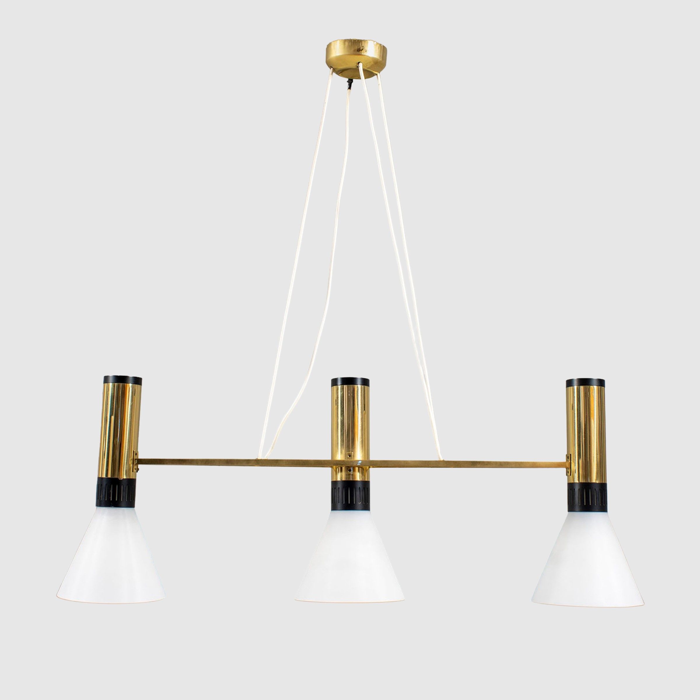 Italia, anni 50 lampada a sospensione in ottone, metallo verniciato e vetro opalino satinato, etichetta della produzione