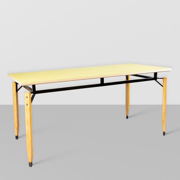 Italia, anni 50 tavolo in legno, metallo verniciato e vetro colorato, difetti