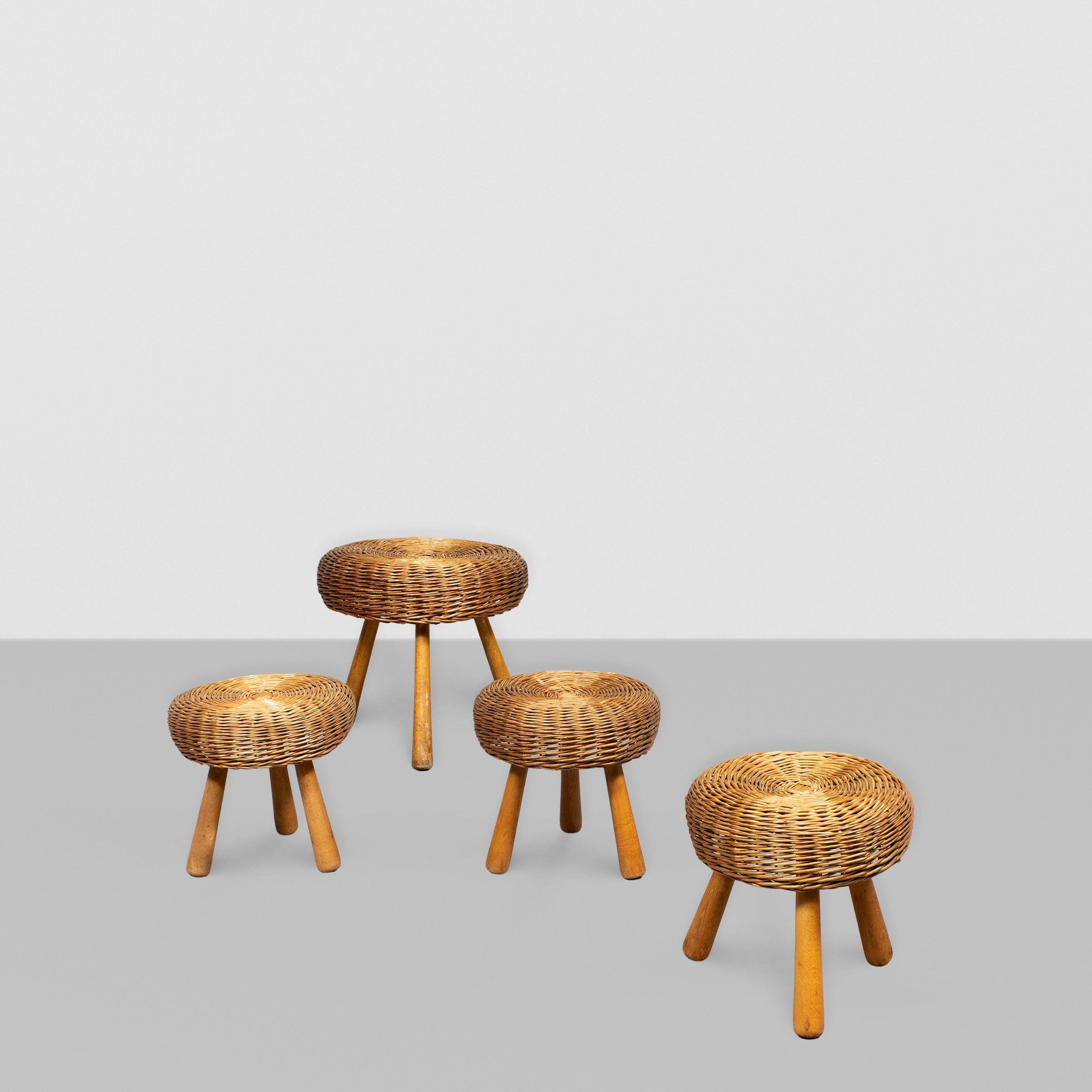 Usa, anni 60 set di quattro sgabelli in legno e midollino.