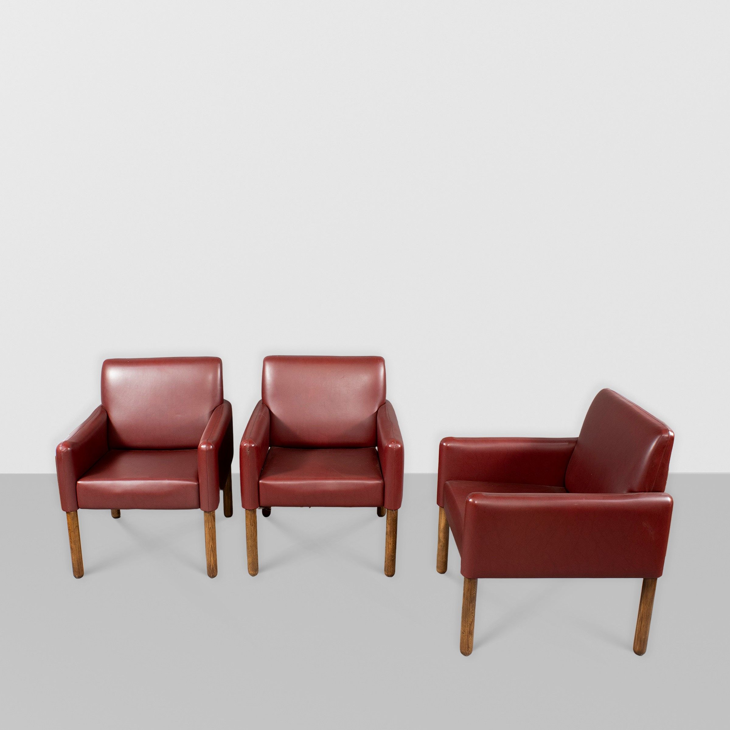 Italia, anni 60 tre poltrone mod. 869 in legno ed ecopelle, etichetta della produzione, usure