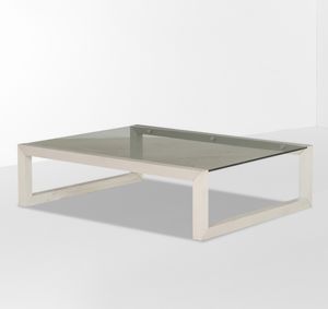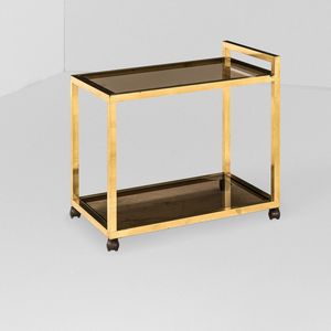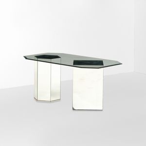 Struttura in ottone e metallo cromato, rivestimento in tessuto e piano in cristallo molato. Prod. Italia, 1970 [..]
