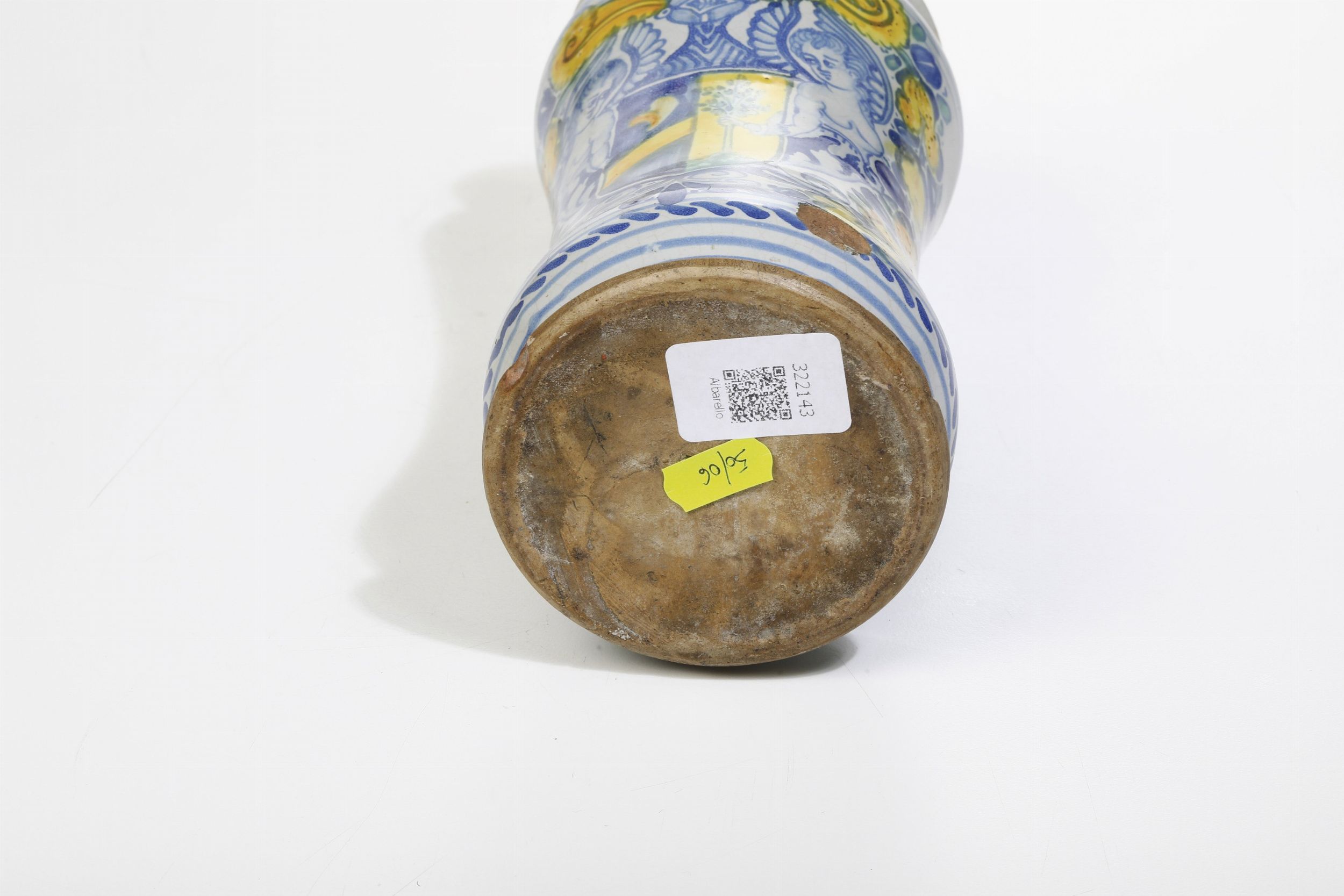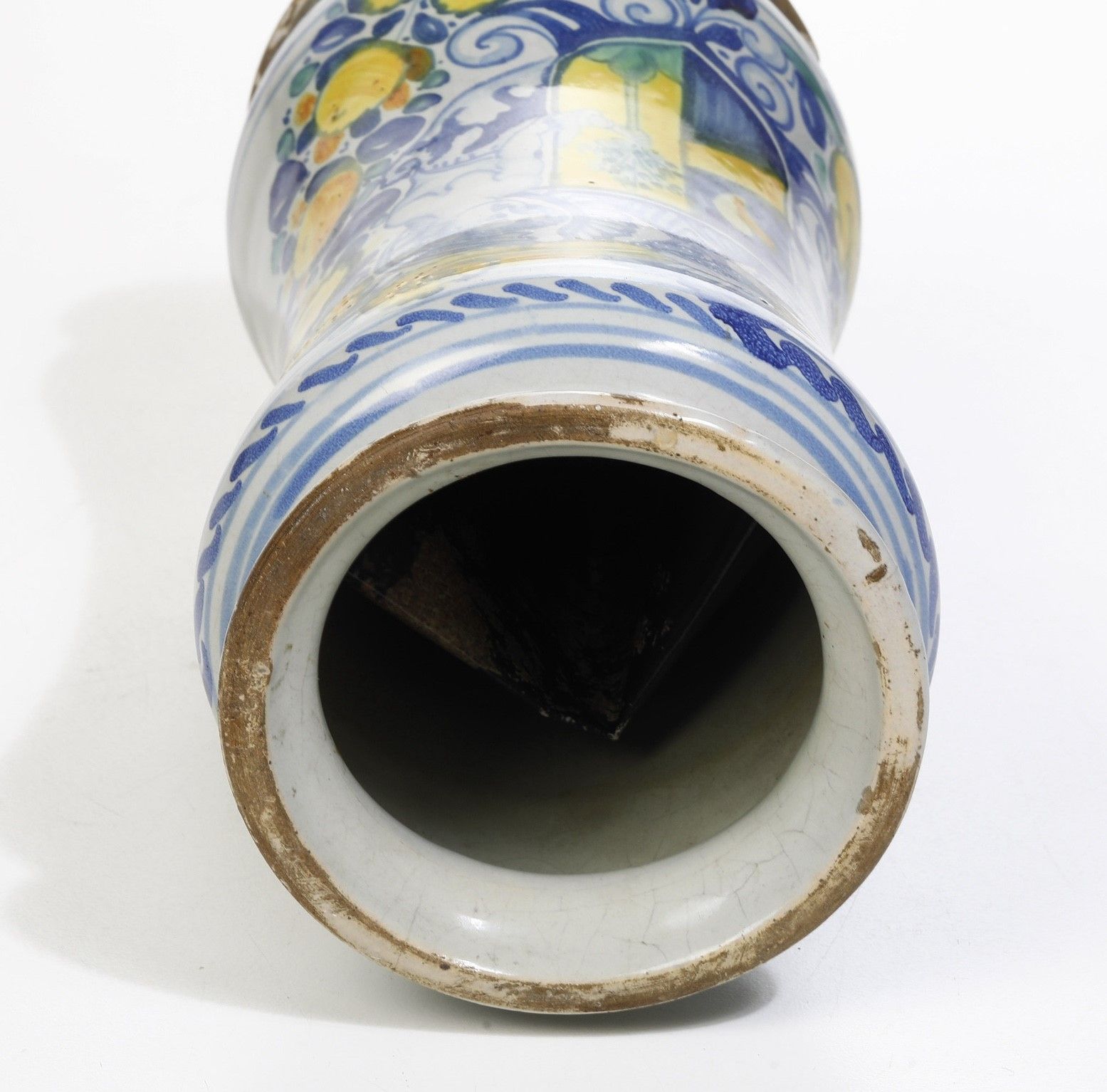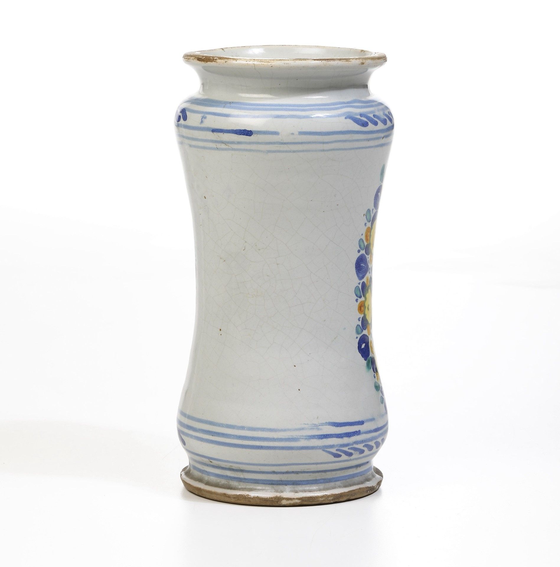 Maiolica. Altezza cm 22 circa. Conservazione: ottima; due sbeccature Albarello cilindrico rastremato al centro, dal labbro estroflesso decorato sul fronte con uno stemma araldico sormontato da elmo piumato. Il blasone è sorretto da due angeli reggi scudo attorniati da ghirlande di frutta Per una coppia di albarelli dello stesso corredo apotecario vedi ad esempio G.Donatone, Maiolica decorativa e popolare di Campania e Puglia, Napoli 1992, fig. 468