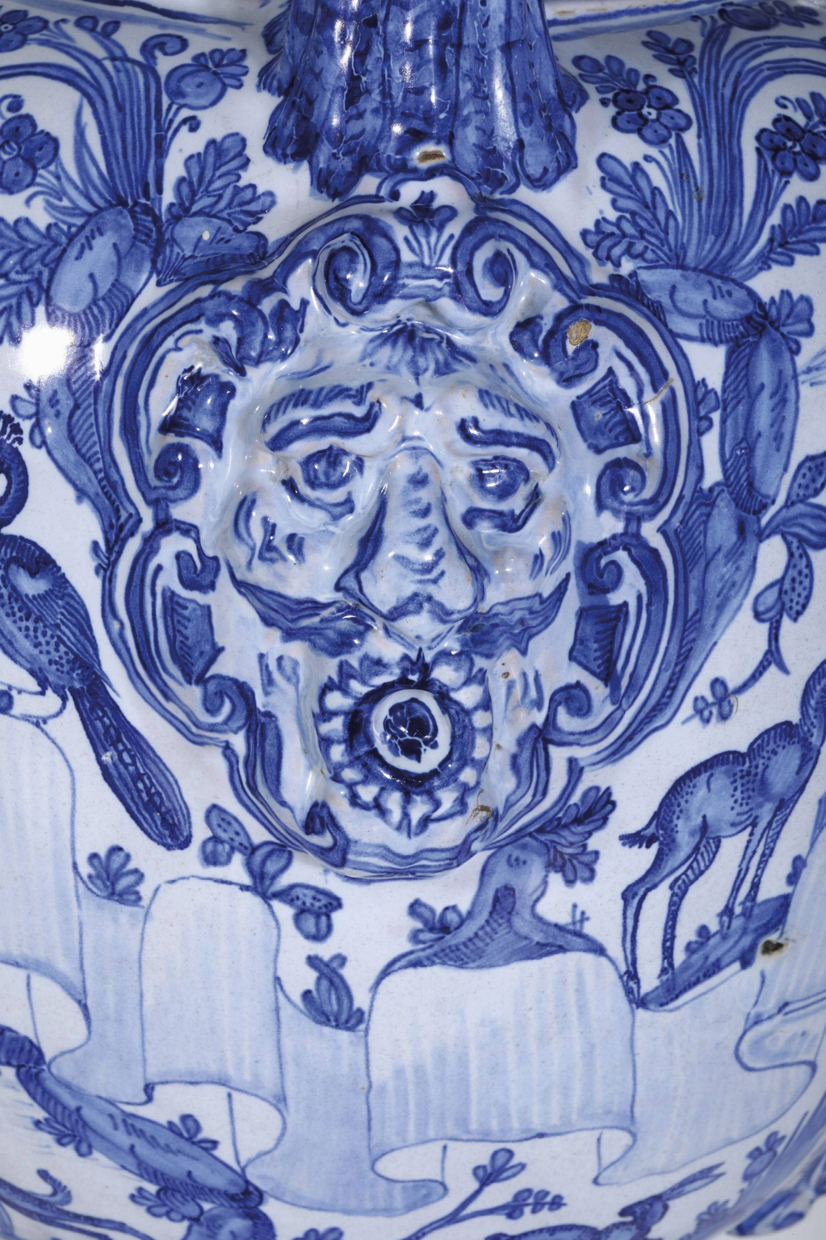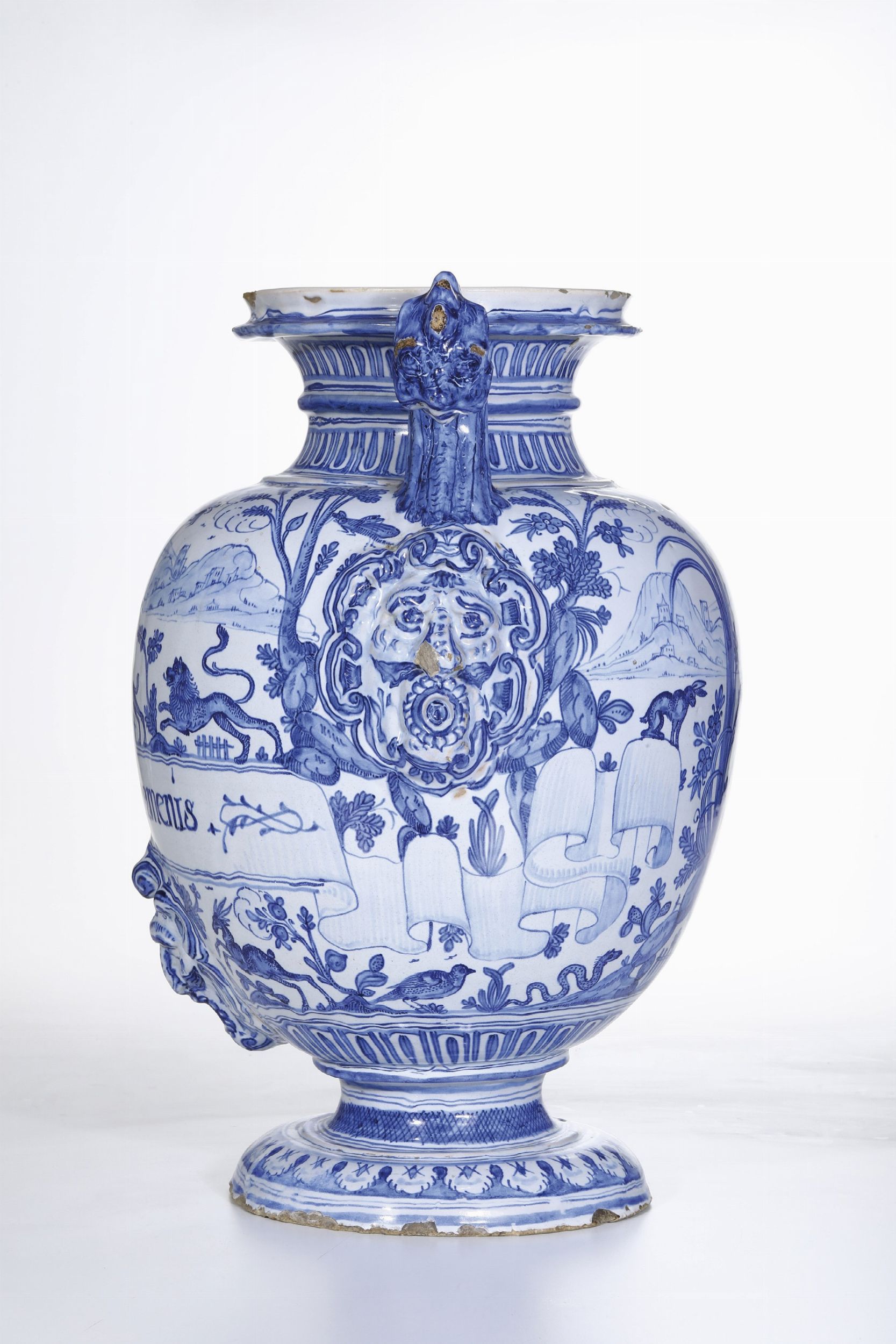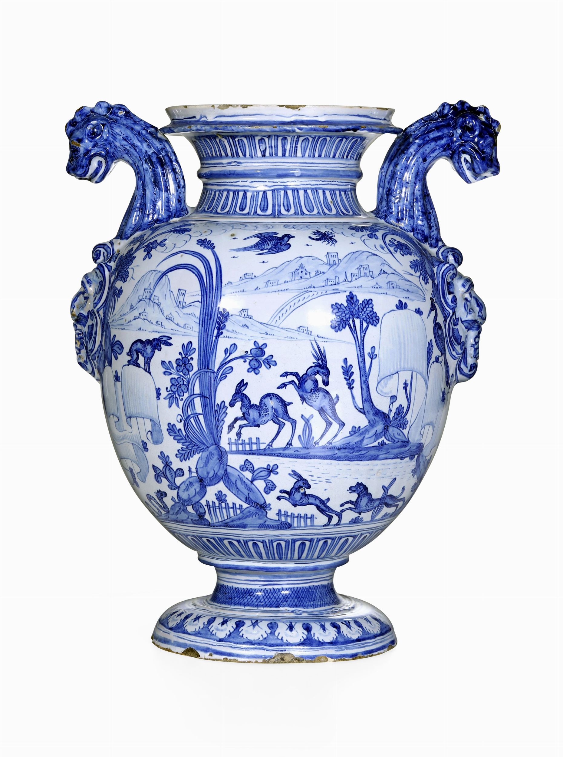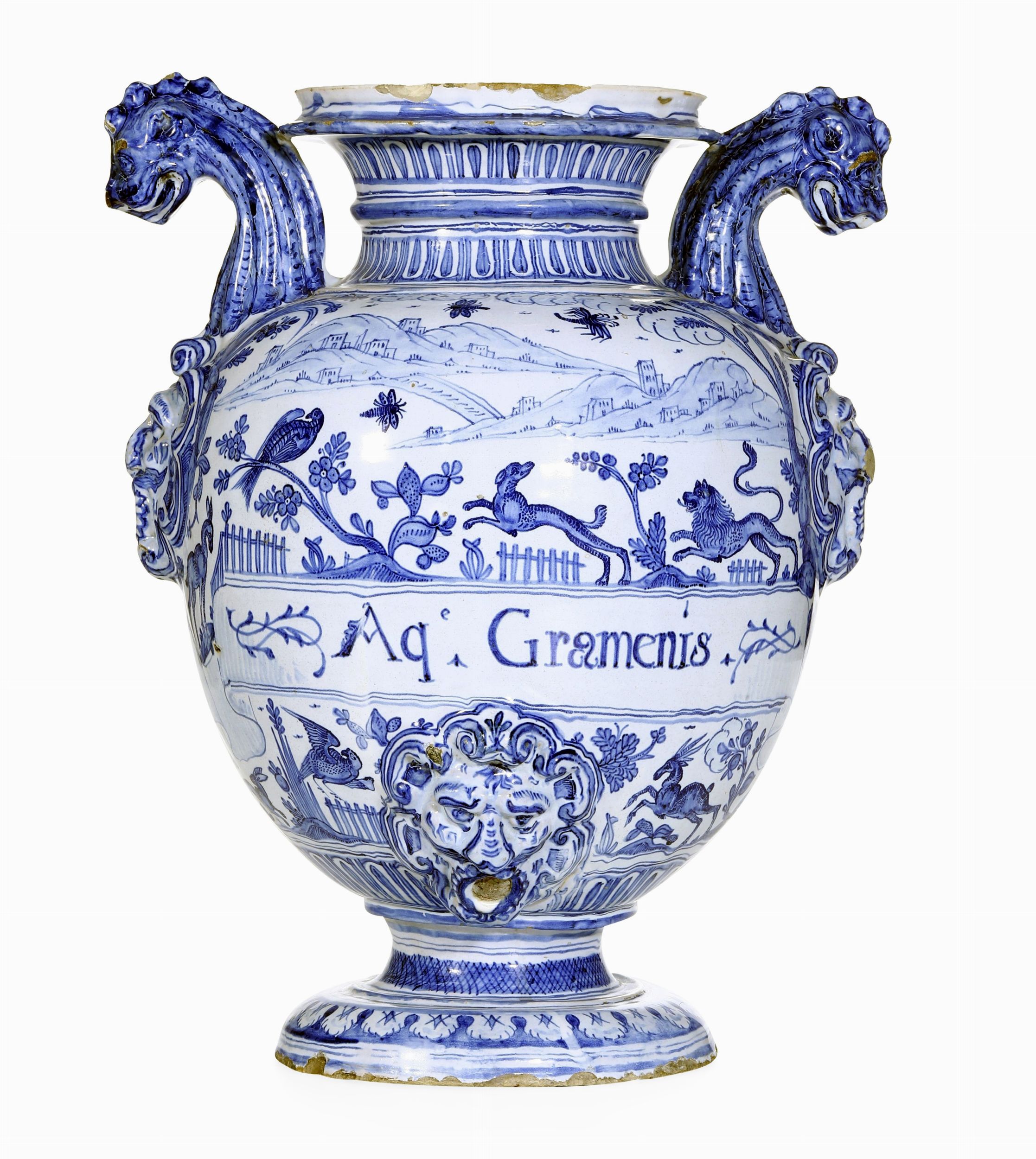 Maiolica. Marca: pesce. Altezza cm 44. Conservazione: ottima; qualche sbeccatura e salti di smalto ai bordi Nel novero delle ceramiche liguri di farmacia lo stagnone assolve il compito di contenere le acque medicinali e dispensarle, nel caso l’acqua di gramigna, tramite l’impiego di una spina o per mezzo di un rubinetto a partire dal XVIII secolo (1). Il grande recipiente ha la consueta forma ovale capovolta di notevole diametro, unita alla salda struttura cilindrica rastremata sia del collo fornito di gronda e cordone sia del piede e appare dotato dei suoi elementi plastici funzionali, le due anse e i tre mascheroni disposti secondo il solito, tutti in ottimo stato di conservazione come del resto l’intera superficie vasale. La superficie maiolicata è appunto di colore “berettino” chiaro, decorata in ogni sua parte, al di sopra e al di sotto dello sviluppo del cartiglio e su tutta la superficie posteriore, mediante piccole figure di varie specie di animali e insetti, isolati o in relazione fra loro, dipinti in monocromia azzurra, collocati all’interno di un vasto paesaggio che per morfologia e vegetazione rammenta l’estremo oriente. La tipologia decorativa impiegata può quindi a ragione definirsi calligrafica riguardo alla qualità del segno di contorno, naturalistica se si considera il soggetto, inoltre orientaleggiante a causa della maniera dei ceramisti liguri di comunicare i modelli iconografici esotici ai quali s’ispirano, mutando l’originale privazione di sostanza della forma dei vari protagonisti nella realtà corporea delle loro vicende terrene. La marca Pesce, dipinta in azzurro sulla superficie interna del piede, assegna la produzione del vaso alla fabbrica albisolese dei Pescio, nel sesto decennio circa del XVII secolo 1. Riguardo al tipo di spillatura v. Arrigo Cameirana, Musei e Gallerie di Milano, Museo d’Arti Applicate, Ceramiche, Tomo I, Martellago 2000, scheda n. 419, p. 368
