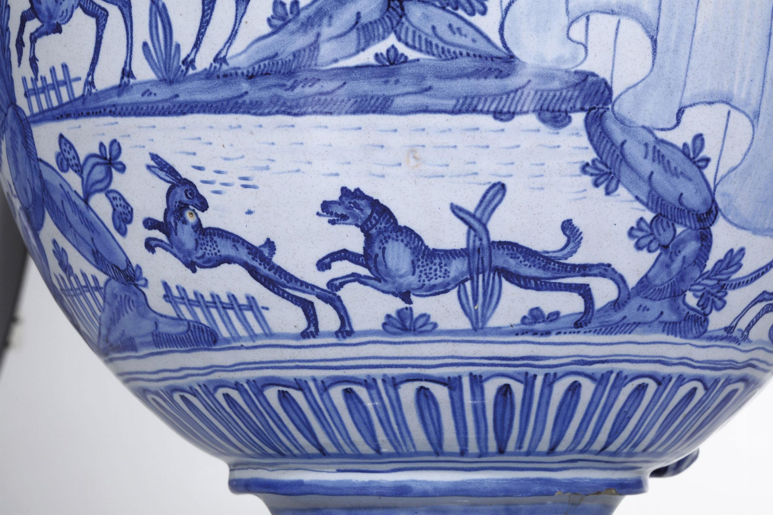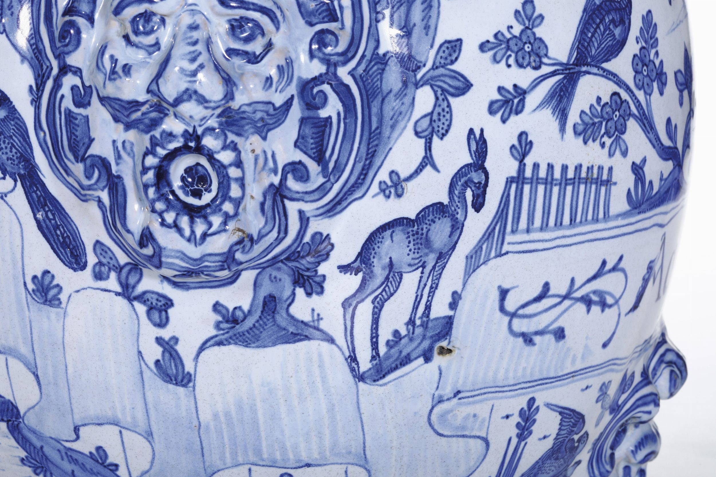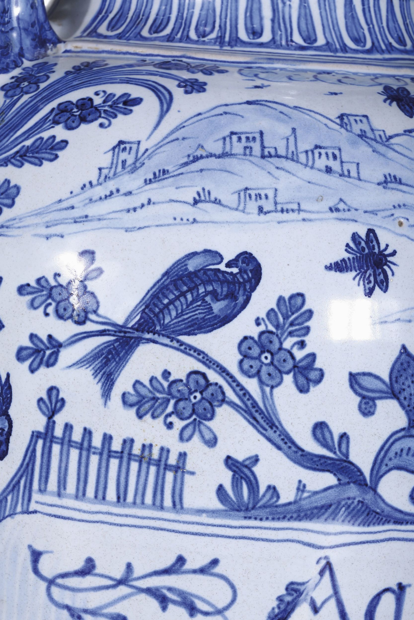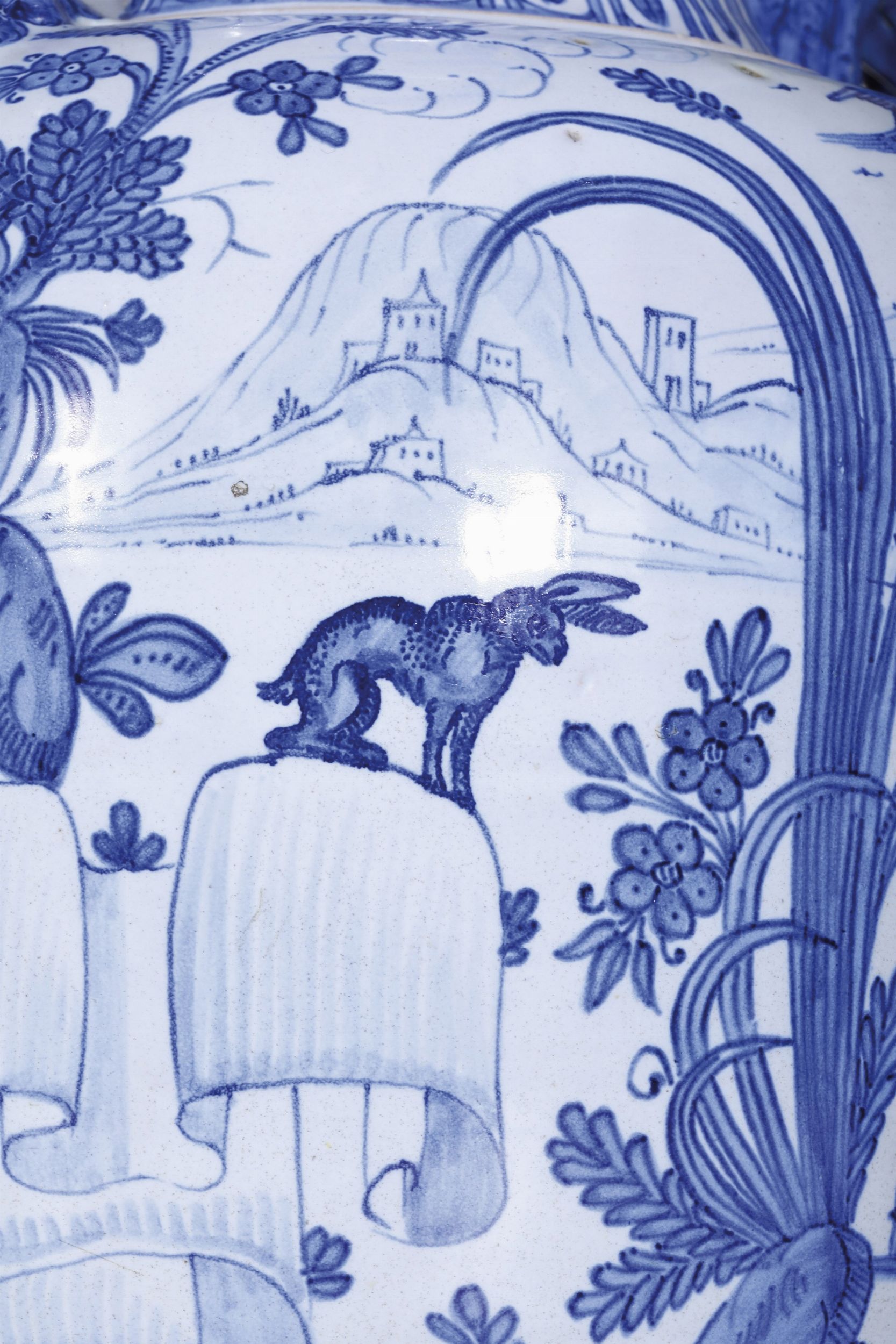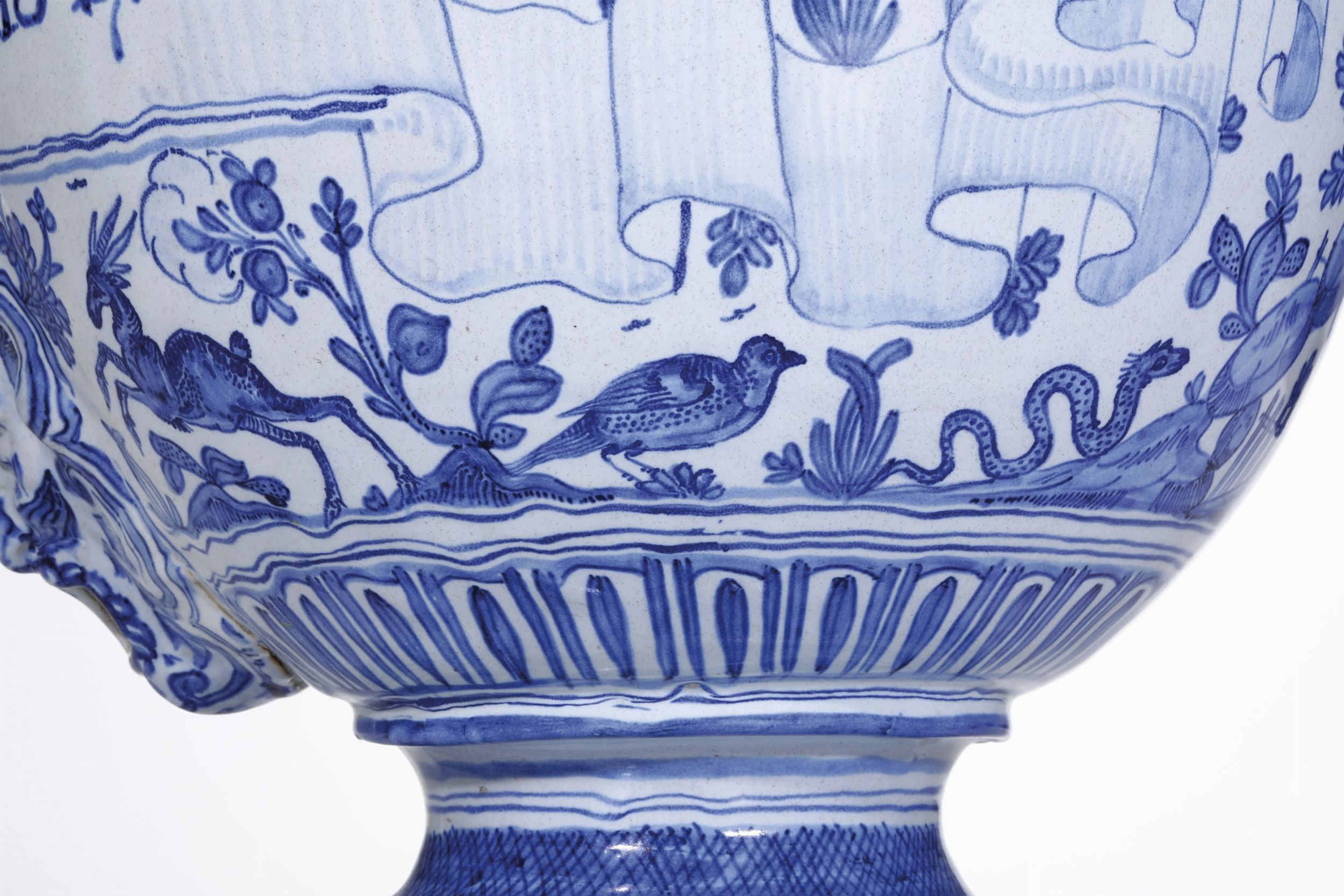 Maiolica. Marca: pesce. Altezza cm 44. Conservazione: ottima; qualche sbeccatura e salti di smalto ai bordi Nel novero delle ceramiche liguri di farmacia lo stagnone assolve il compito di contenere le acque medicinali e dispensarle, nel caso l’acqua di gramigna, tramite l’impiego di una spina o per mezzo di un rubinetto a partire dal XVIII secolo (1). Il grande recipiente ha la consueta forma ovale capovolta di notevole diametro, unita alla salda struttura cilindrica rastremata sia del collo fornito di gronda e cordone sia del piede e appare dotato dei suoi elementi plastici funzionali, le due anse e i tre mascheroni disposti secondo il solito, tutti in ottimo stato di conservazione come del resto l’intera superficie vasale. La superficie maiolicata è appunto di colore “berettino” chiaro, decorata in ogni sua parte, al di sopra e al di sotto dello sviluppo del cartiglio e su tutta la superficie posteriore, mediante piccole figure di varie specie di animali e insetti, isolati o in relazione fra loro, dipinti in monocromia azzurra, collocati all’interno di un vasto paesaggio che per morfologia e vegetazione rammenta l’estremo oriente. La tipologia decorativa impiegata può quindi a ragione definirsi calligrafica riguardo alla qualità del segno di contorno, naturalistica se si considera il soggetto, inoltre orientaleggiante a causa della maniera dei ceramisti liguri di comunicare i modelli iconografici esotici ai quali s’ispirano, mutando l’originale privazione di sostanza della forma dei vari protagonisti nella realtà corporea delle loro vicende terrene. La marca Pesce, dipinta in azzurro sulla superficie interna del piede, assegna la produzione del vaso alla fabbrica albisolese dei Pescio, nel sesto decennio circa del XVII secolo 1. Riguardo al tipo di spillatura v. Arrigo Cameirana, Musei e Gallerie di Milano, Museo d’Arti Applicate, Ceramiche, Tomo I, Martellago 2000, scheda n. 419, p. 368