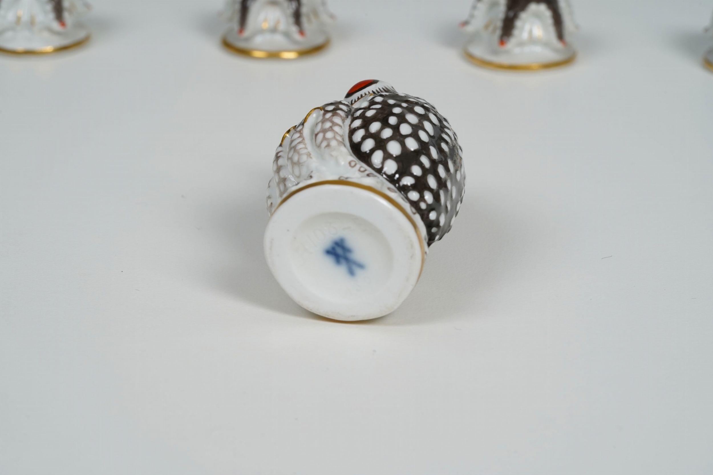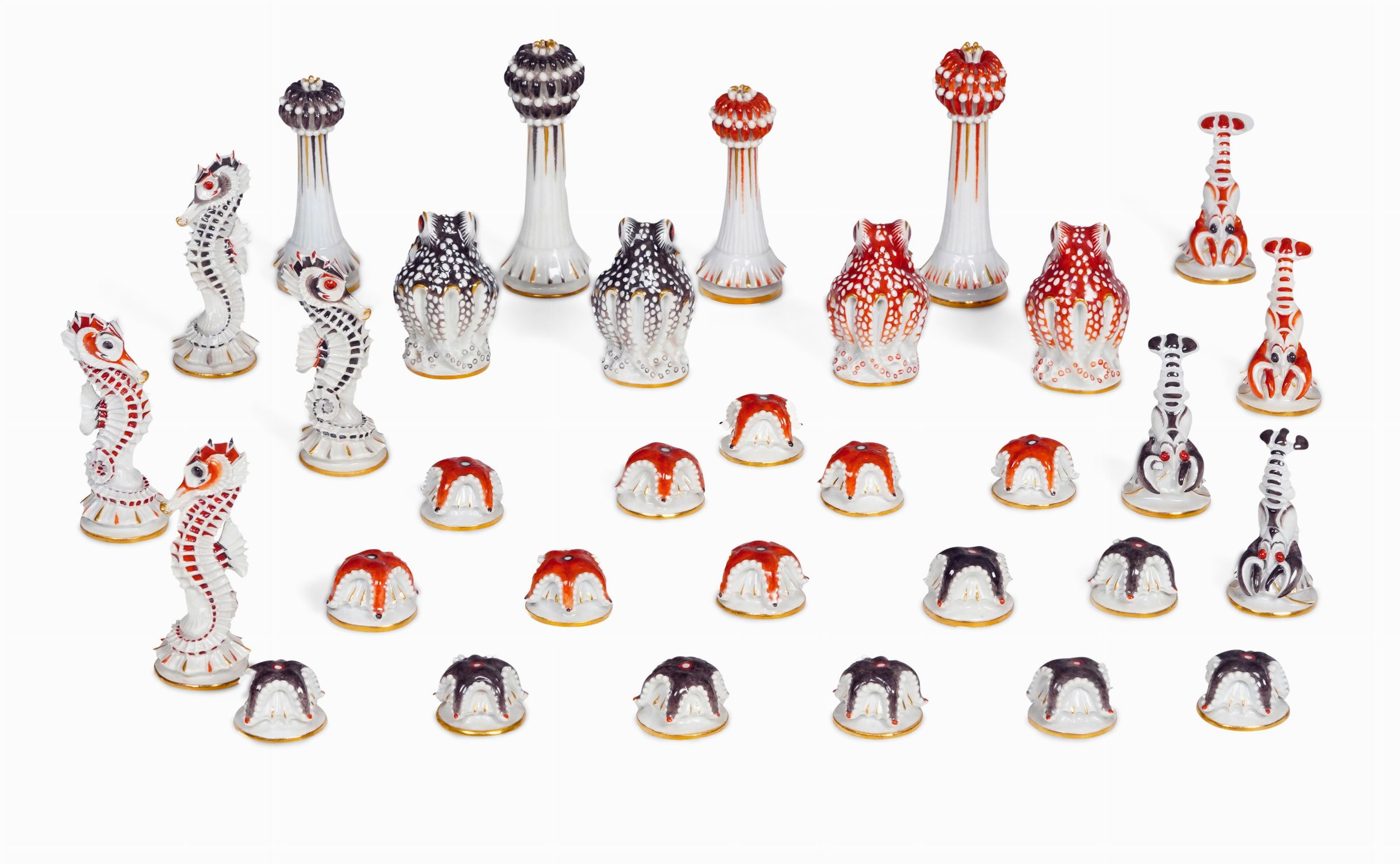 Porcellana. Marca: spade in blu e numeri diversi impressi. Altezza massima cm 8,2; minima cm 1,7. Conservazione: ottima Questa eccezionale serie completa di pedine per il gioco degli scacchi è formata da elementi marini Per altri esempi di questo modello, si veda D.M.Liddell, Chessmen, New York, p. 66; H.&S.Wichmann, Schach. Ursprung und Wandlung der Spielfigur in zwölf Jahrhunderten, München 1960, tav. 190; oppure quelli passati in vendita da Sotheby's, New York, The John Harbeson Collection, 5 ottobre 1979, lotto 569; Sotheby’s, New York, Property from the Collection of Mrs. Paul Mellon: Interiors, 21-23 novembre 2014, lotto 319;. Bonhams, Los Angeles, The Elegant Home Select Furniture, Silver, Decorative and Fine Arts, 8 December 2015, lotto 1598