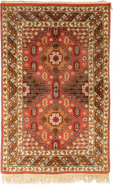 cm 190x123 esempio della tradizione tessile turca, caratterizzato da un design raffinato e colori caldi ed equilibrati. Al centro del campo spicca un grande medaglione floreale circondato da motivi geometrici e dettagli floreali stilizzati. Le tonalità predominanti, come il rosso mattone e il marrone, si combinano armoniosamente con sfumature più chiare di avorio e giallo ocra, creando un effetto visivo equilibrato e accogliente. La bordura presenta decorazioni geometriche intrecciate con elementi floreali, donando al tappeto un ulteriore senso di profondità e movimento.