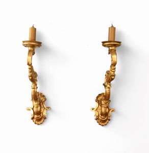 Coppia di candelieri italiani in legno dorato, Luigi XVI