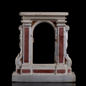 Altezza x larghezza x profonditĂ 38x 35x 15 cm XVII secolo in marmo bianco di Carrara, il fronte, a motivo architettonico [..]