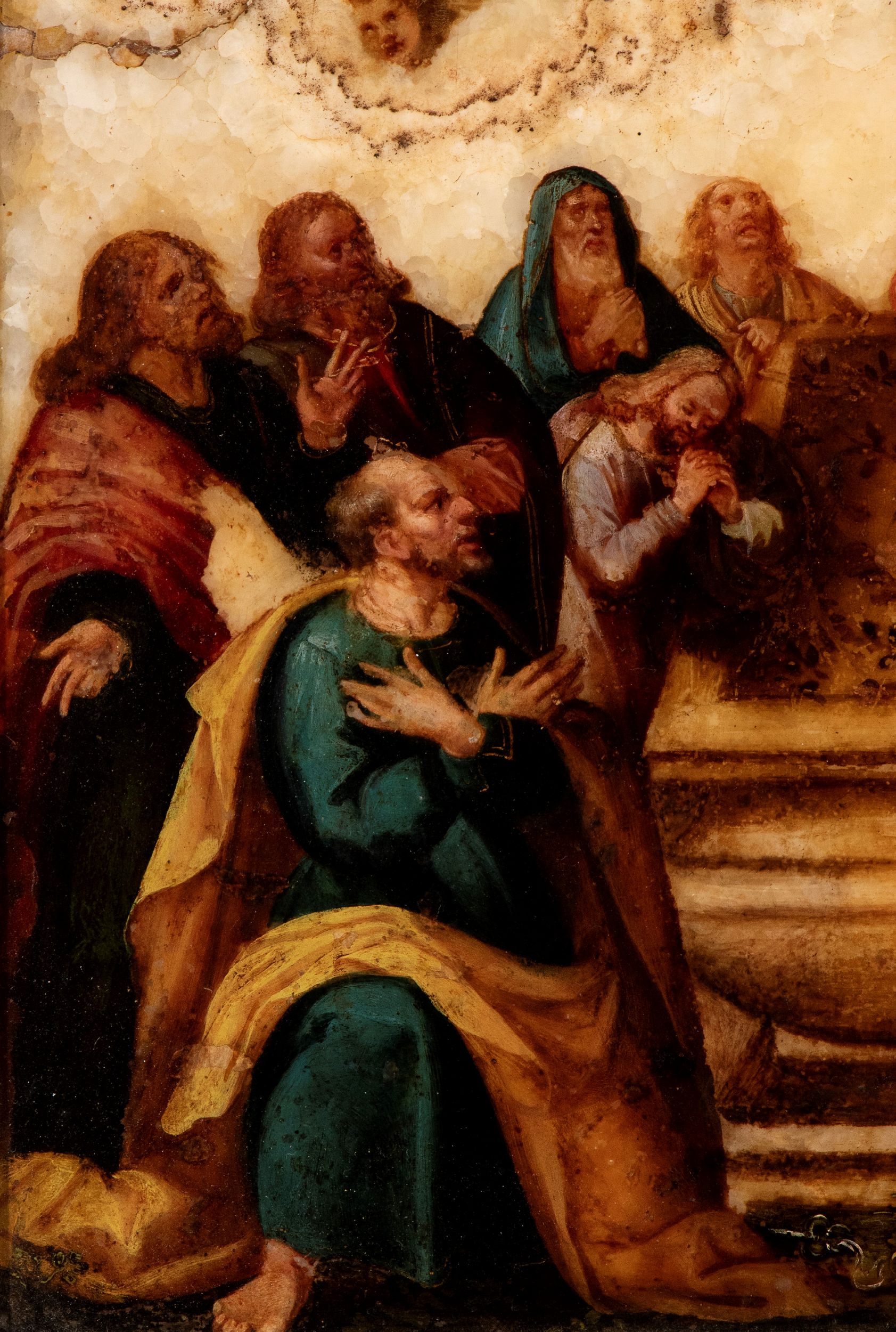 Altezza x larghezza x profondità : 85 x 53 x 9 cm - 63 x 33 cm pietra) Italia, XVII secolo dipinto raffigurante gli apostoli poggiati sul sarcofago della Vergine che assistono all'assunzione in Cielo circondata da angeli; copia dell'opera dei fratelli Simone e Giovan Francesco De Magistris. Il quadro su piano di alabastro reca un foro sul retro che serviva ad illuminare il volto della Madonna tramite candela.