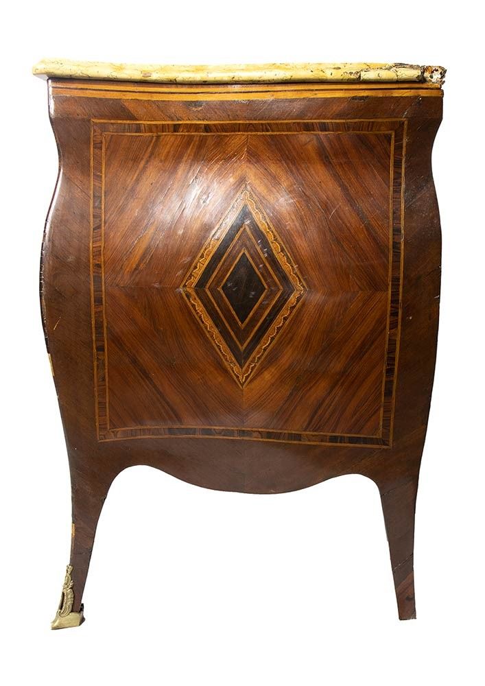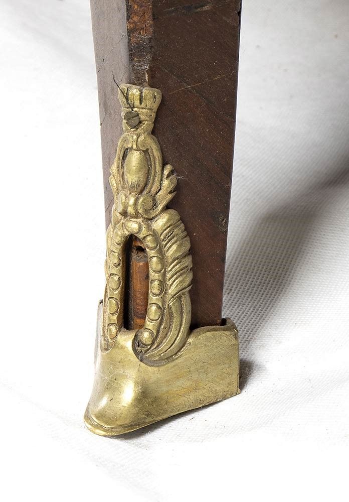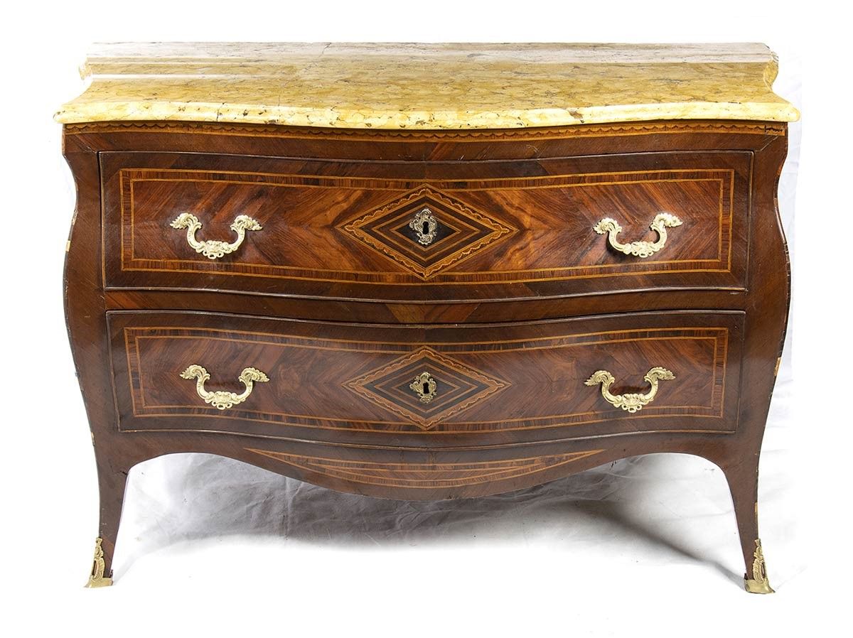 Napoli, XVIII secolo lastronato in noce e intarsiato con motivi geometrici, fronte a due cassetti con gambe a sciabola. Piano in marmo giallo di Siena e piedini in bronzo dorato.