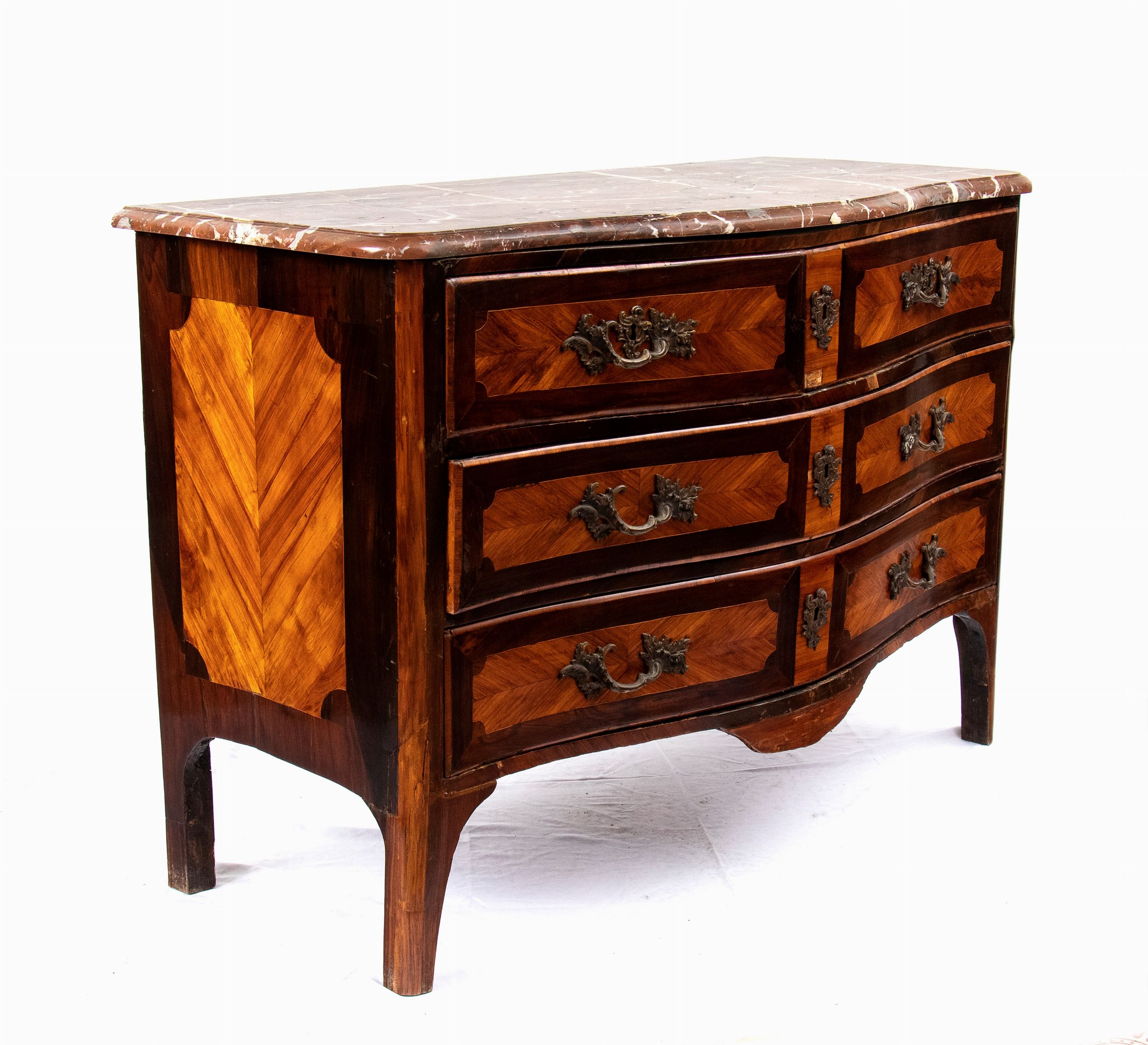 Altezza x larghezza x profondità : 87 x 121 x 61 cm. XVIII secolo lastronato in ebano viola e palissandro con piano in marmo rosso di Francia (rouge incarnat), fronte mosso a due cassetti piu altri due sotto il piano, maniglie e bocchette in bronzo dorato coeve.