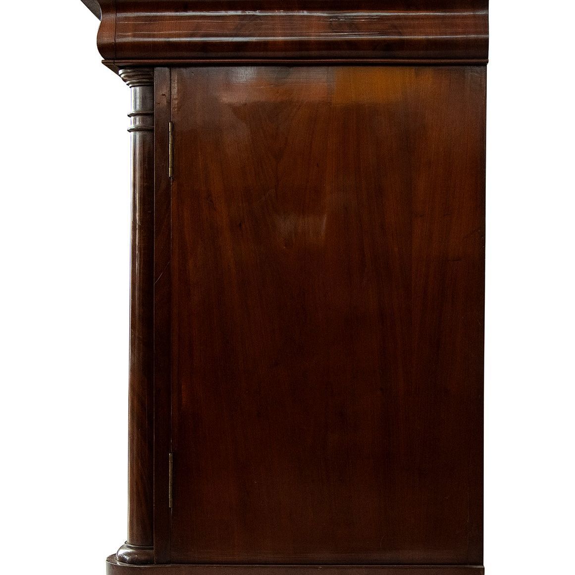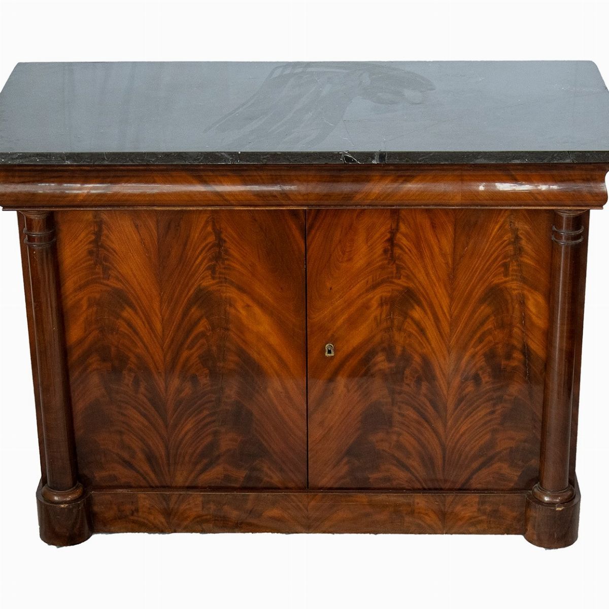 Altezza x larghezza x profondità: 95 x 130 x 59,5 cm. inizio XIX secolo piano in marmo “nero di Belgio” con cassetto sottopiano e due sportelli che celano 3 cassetti con maniglie in bronzo dorato, chiave a fiore.
